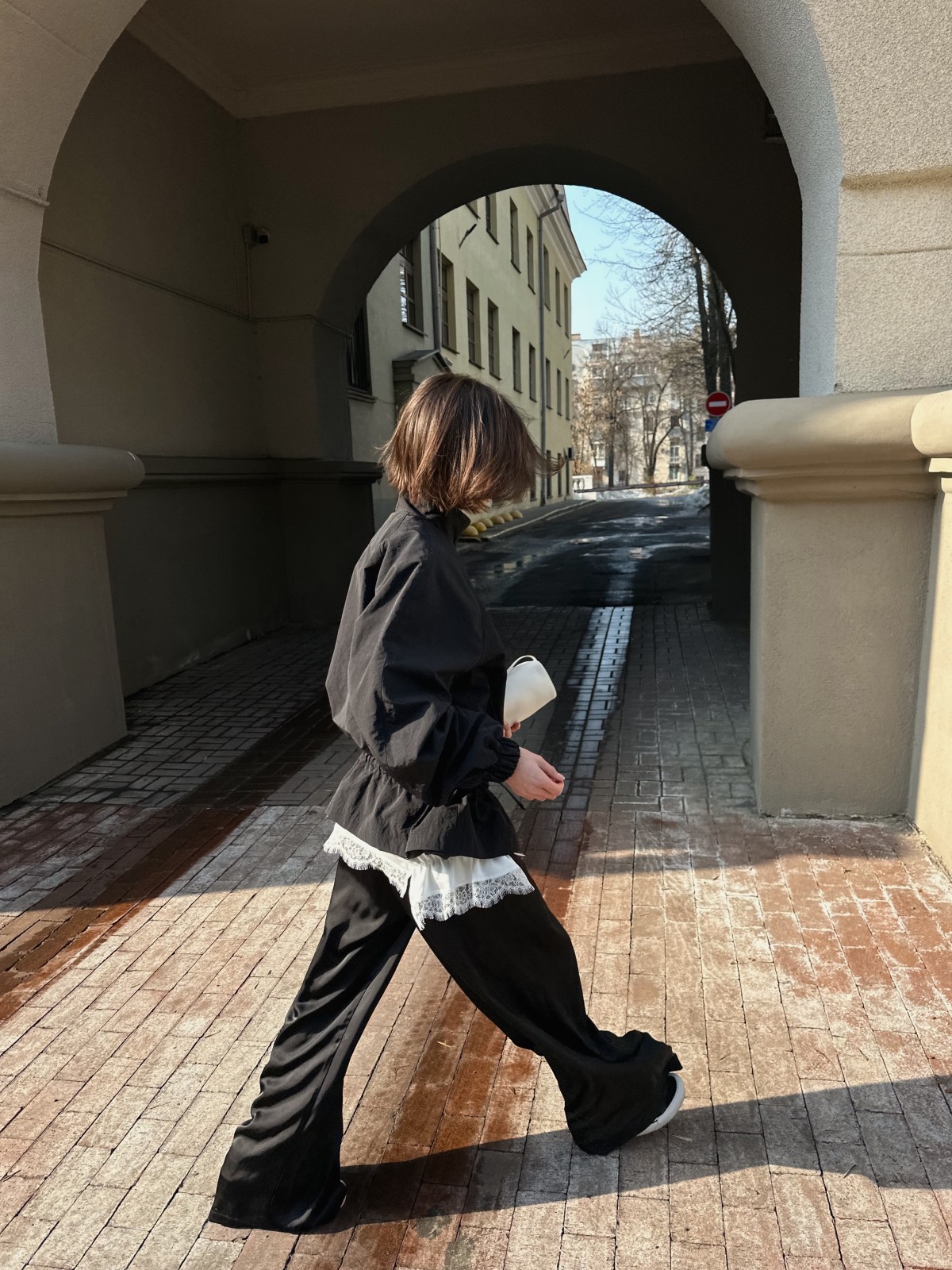 Низ украшен деликатным кружевом, которое добавляет женственности и лёгкой романтики. Баску можно носить поверх платья, юбки, брюк или даже жакета — она сразу делает образ более сложным и интересным.
