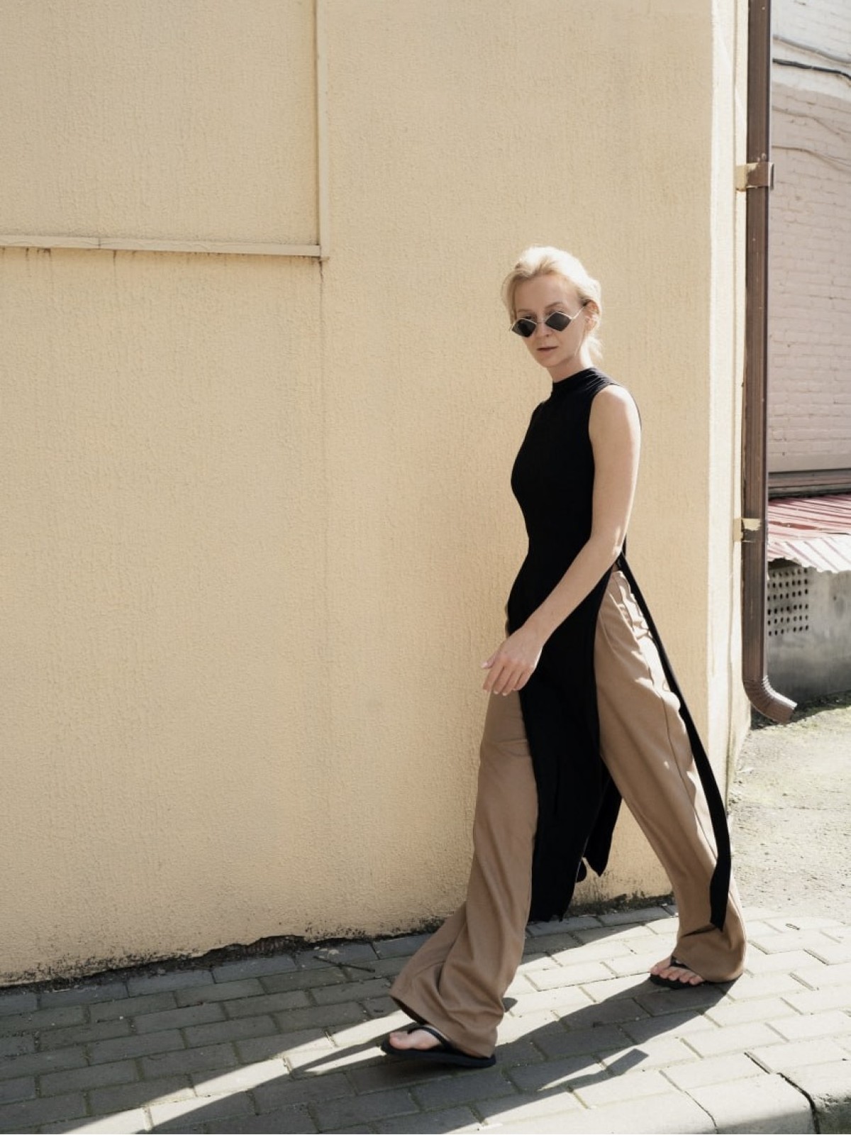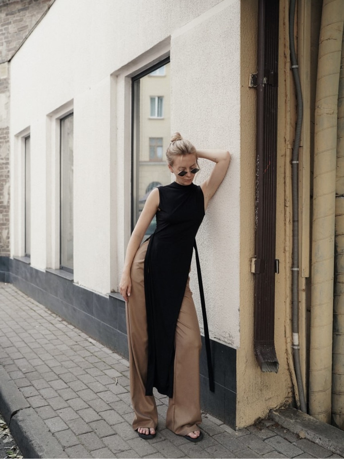 Акцентные детали топы: глубокие разрезы по бокам и шлейки от линии талии, которые можно оставить в опущенном виде или обкрутить вокруг талии.