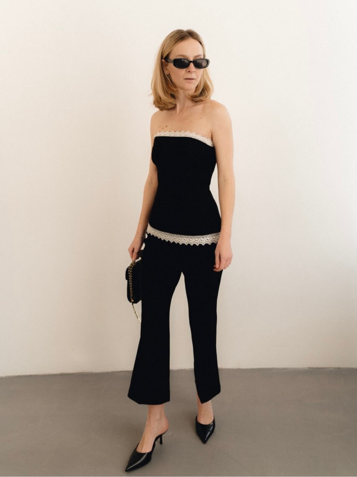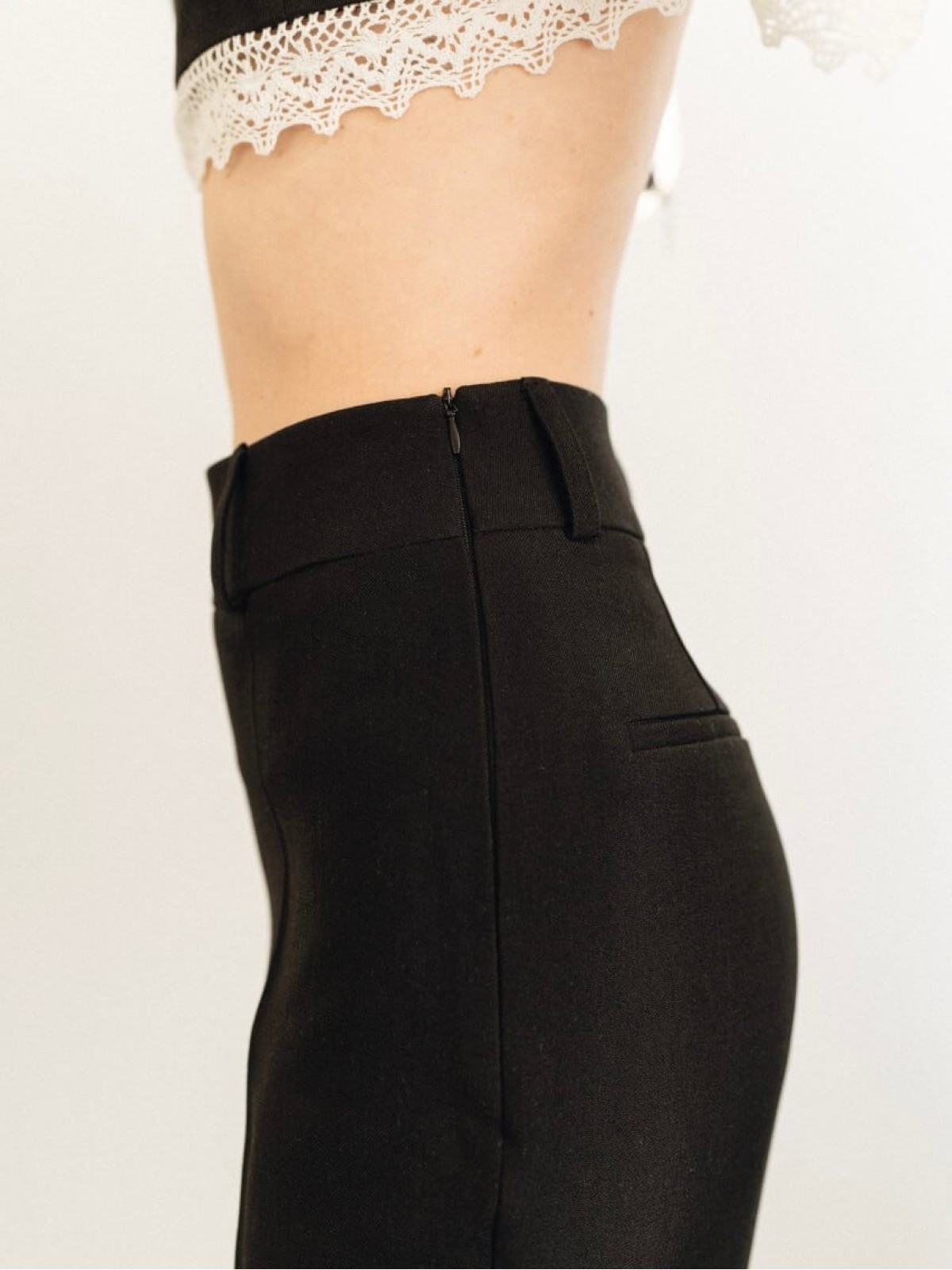 Ткань плотная, держит форму и при этом комфортна в носке. Брюки не просвечивают, аккуратно садятся по бёдрам и создают чистую, собранную линию силуэта.