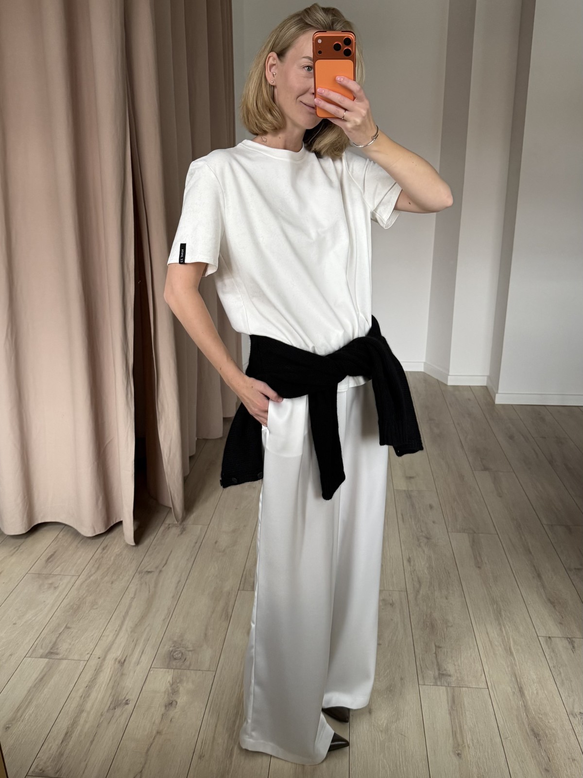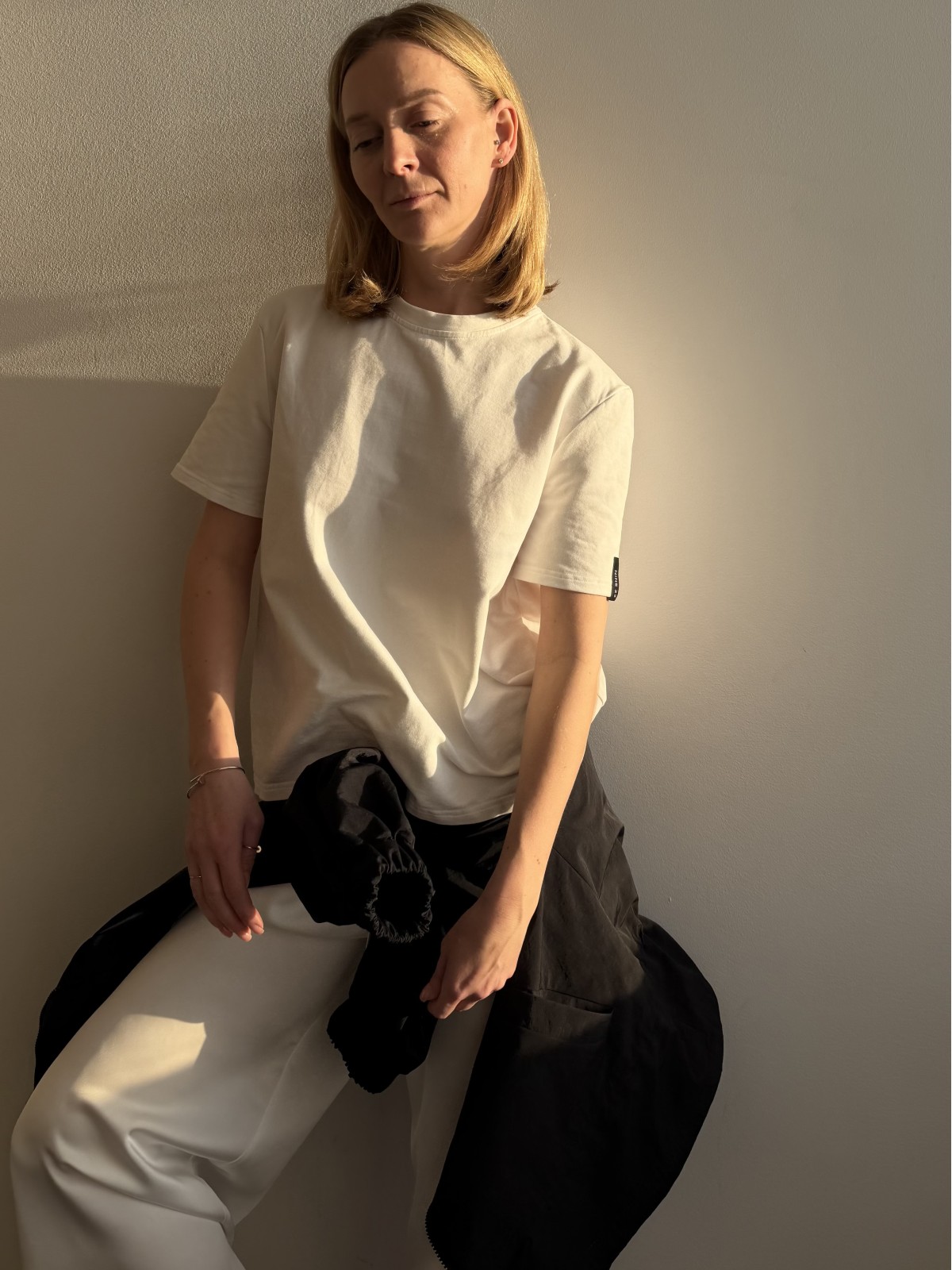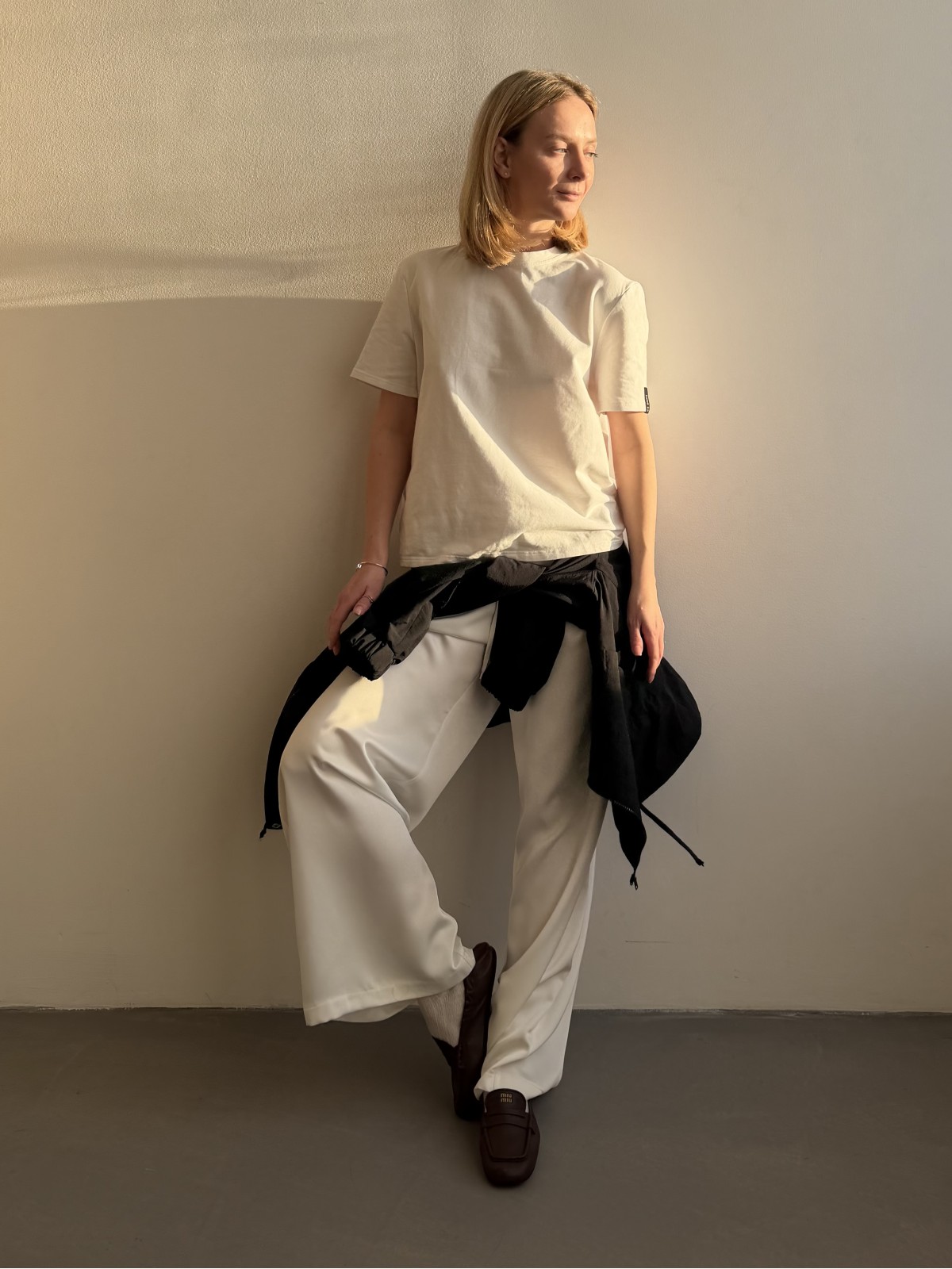 Минималистичное лого на рукаве добавляет стильный акцент, делая образ современным и лаконичным.