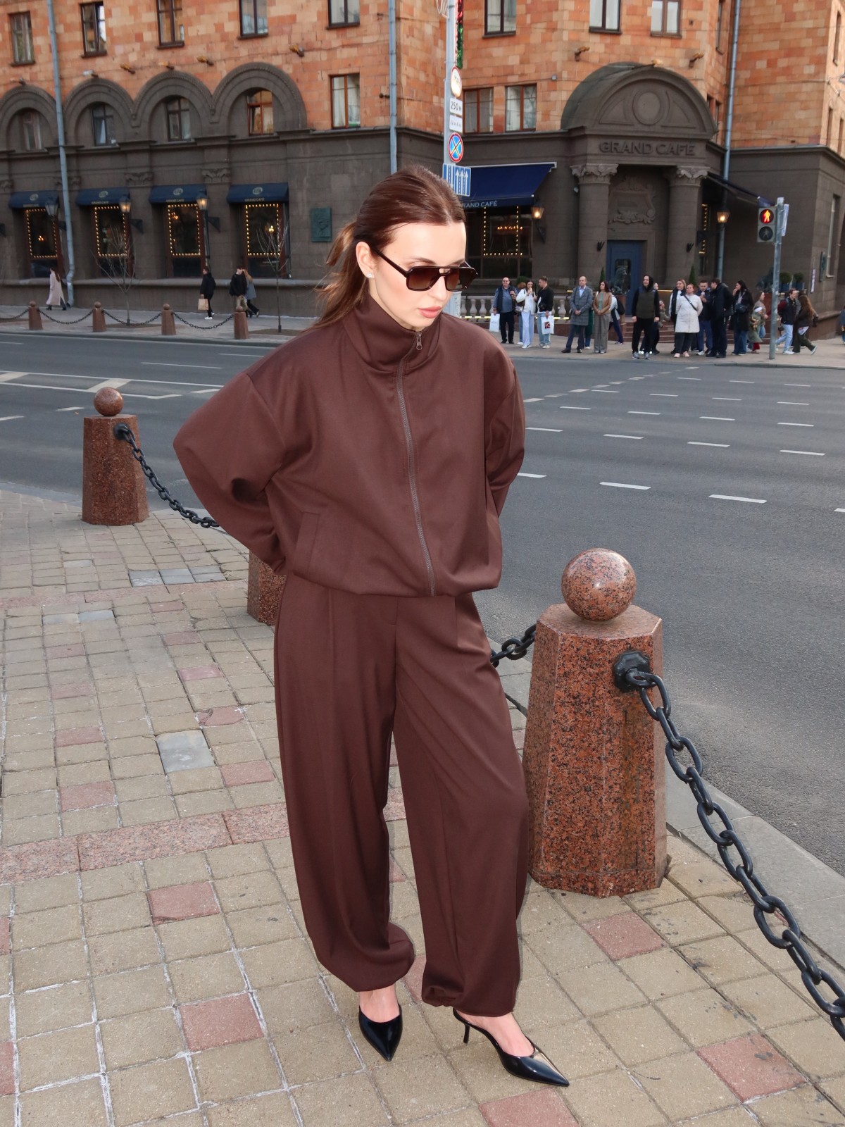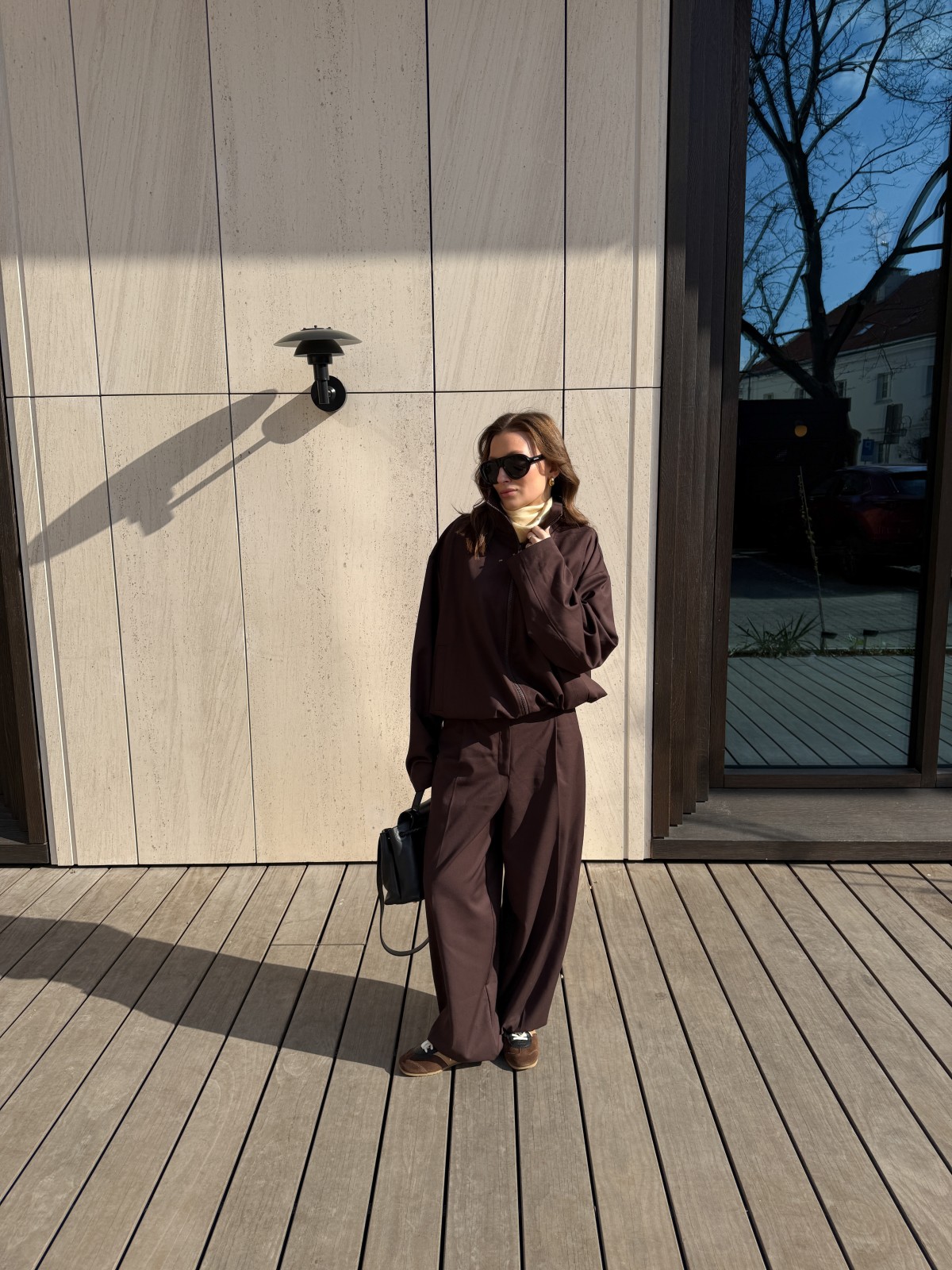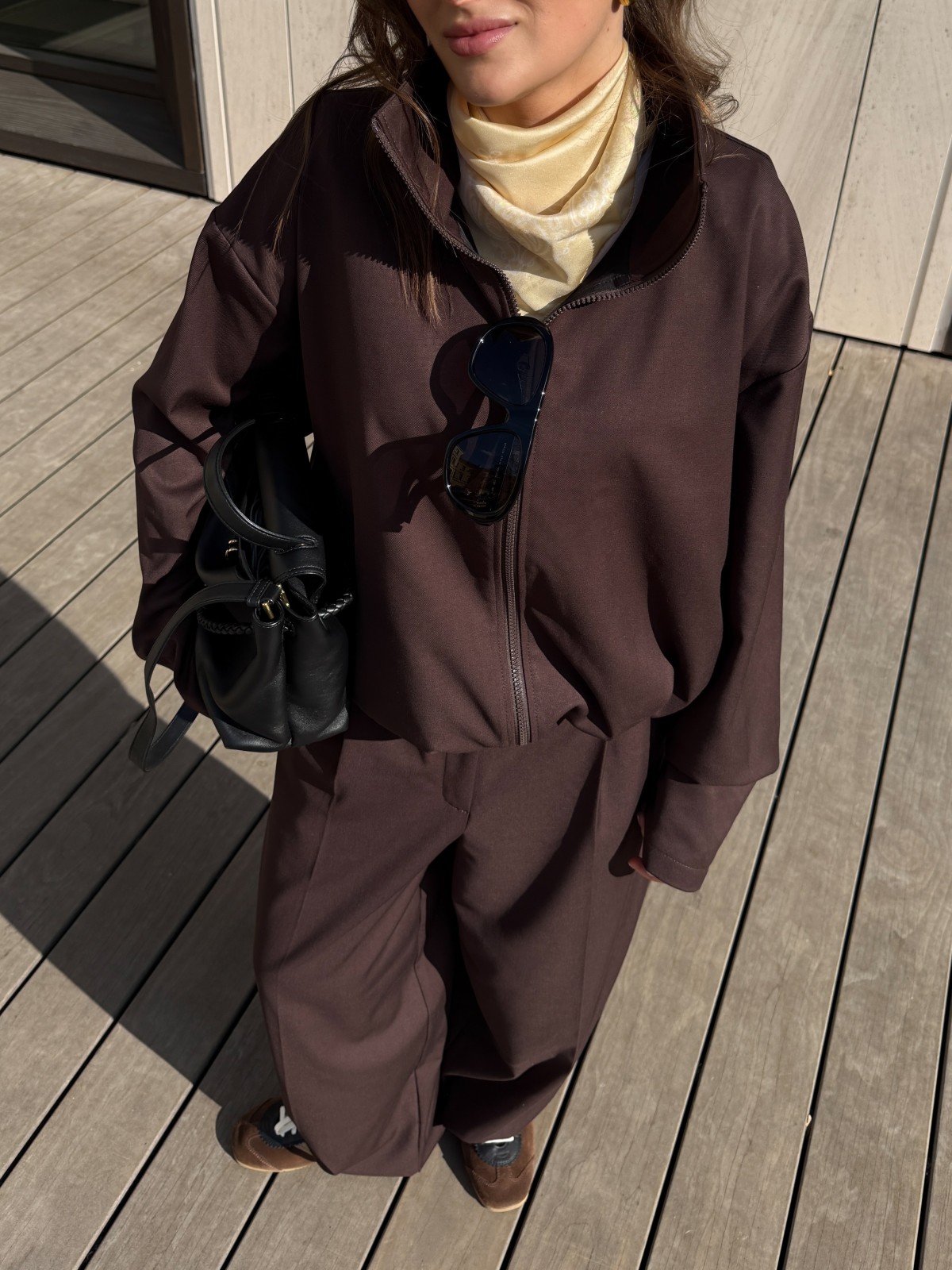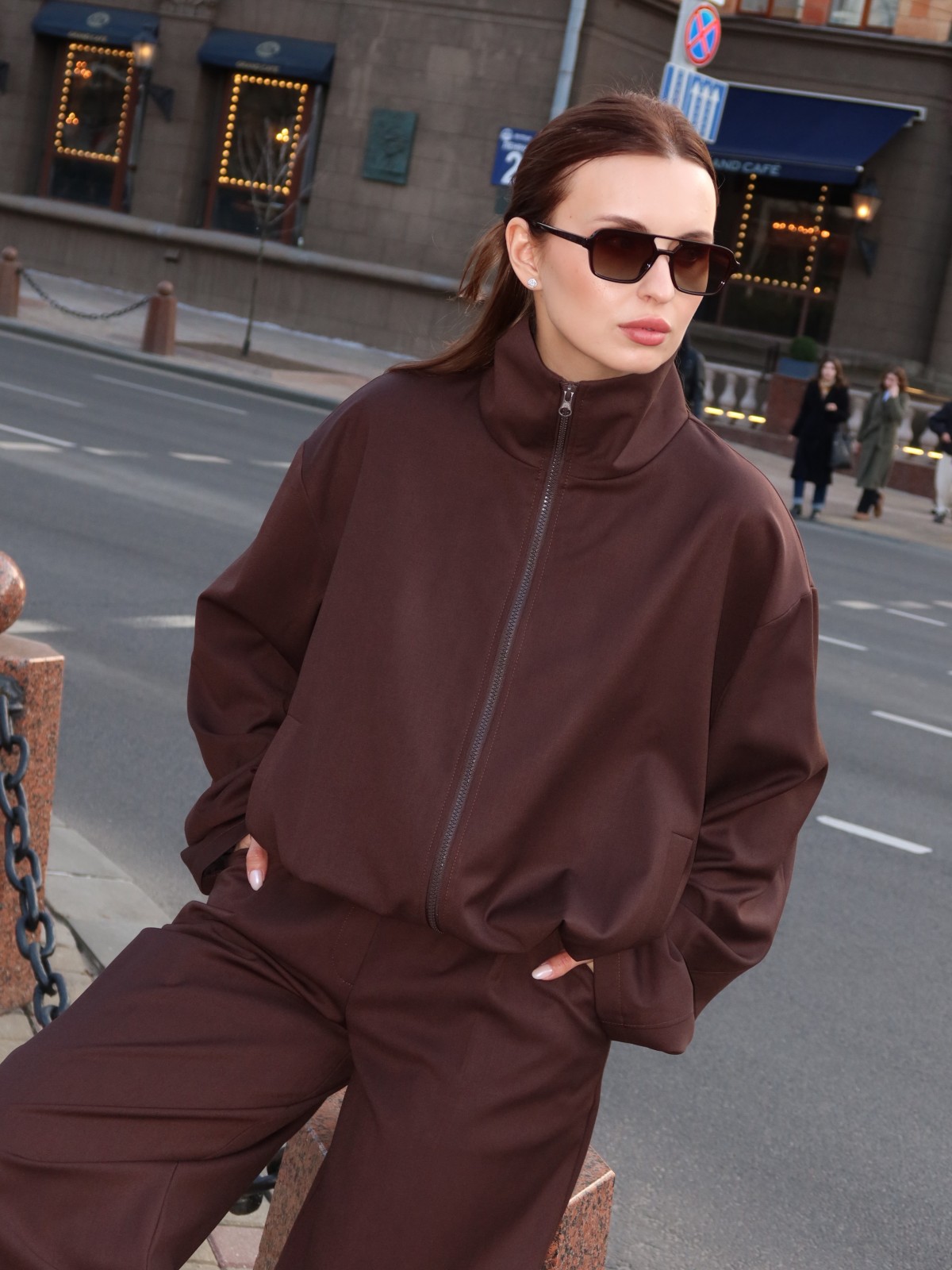 Глубокий шоколадный оттенок делает образ собранным и дорогим, а лаконичный крой — универсальным для города и повседневной жизни.