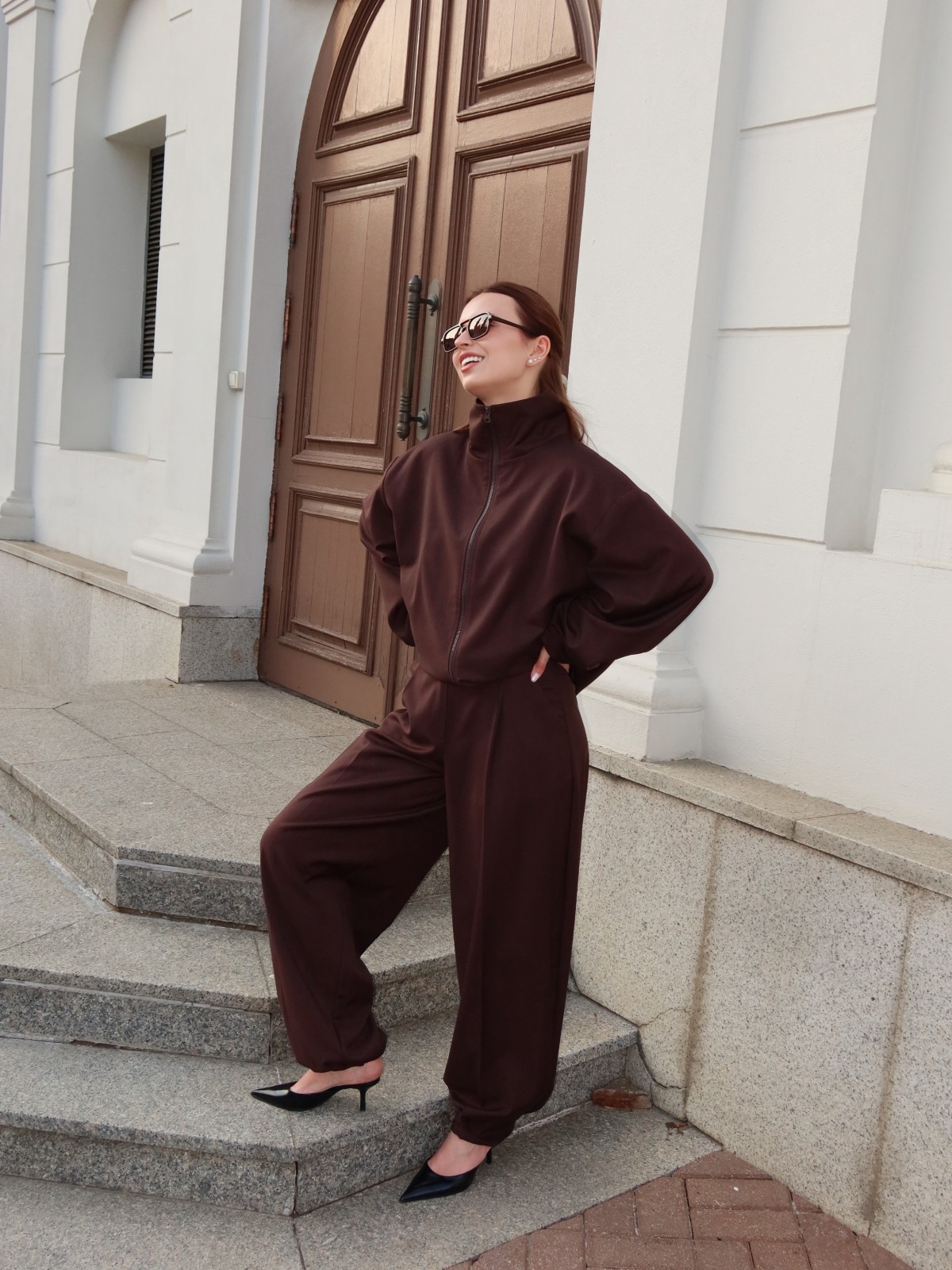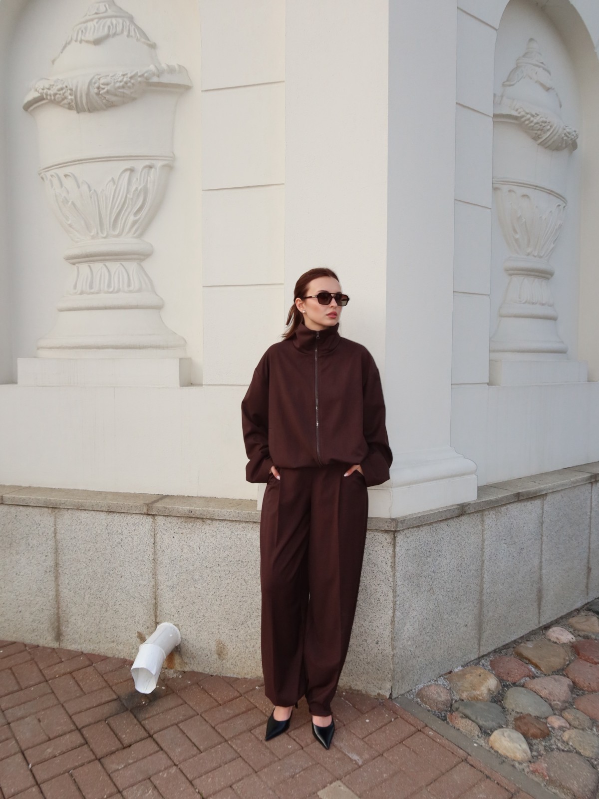 Короткая олимпийка на молнии с высоким воротником формирует чёткий, современный силуэт и легко стилизуется слоями. Прямые брюки с кулиской внизу мягко ложатся по фигуре и при необходимости легко трансформируются в брюки-алладины, сохраняя свободу движения и лёгкость образа.