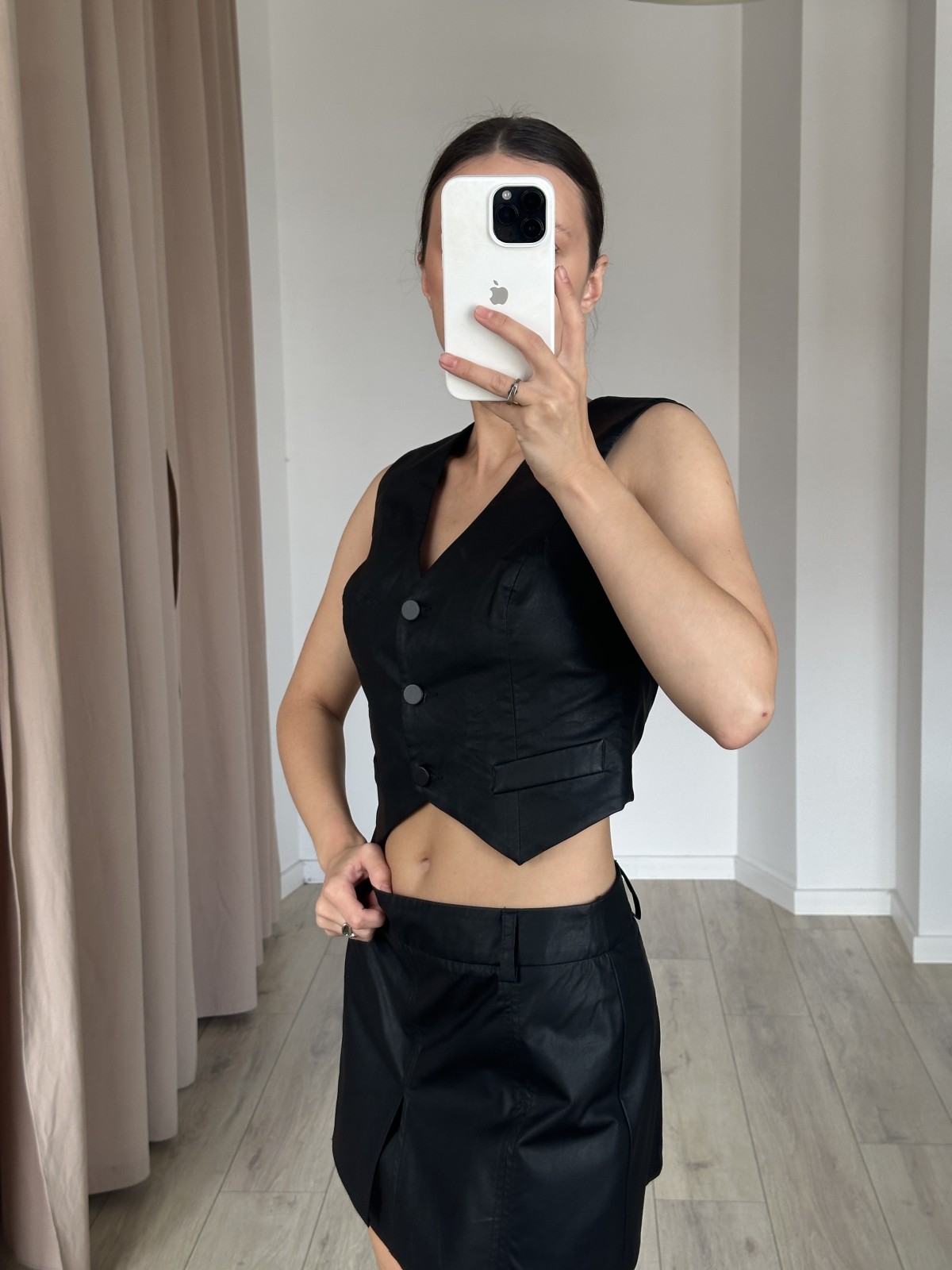Классический жилет черного цвета из эко-кожи. Самостоятельное изделие и элемент костюма с брюками и юбками. Крой прямой, посадка свободная. Специфика кроя: прямой силуэт, геометрический вырез по нижнему краю спереди. Функциональные детали: застежка на пуговицы и декоративные карманы-листочки.