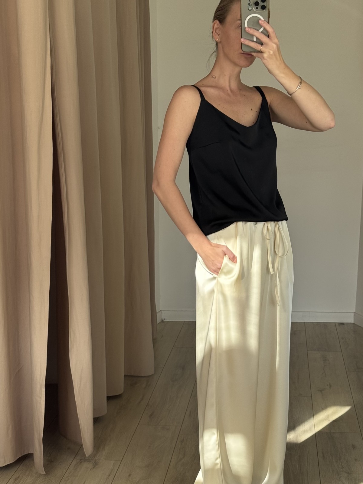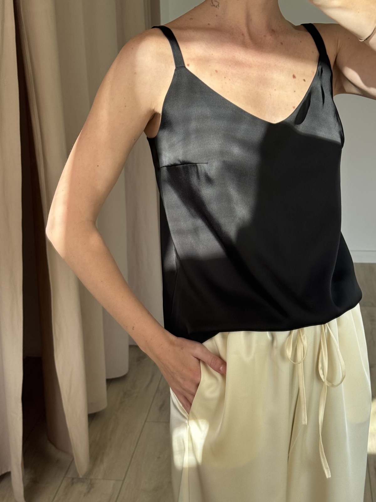 Шелковый топ на бретелях. Яркий акцент твоего образа и дополнение в повседневный гардероб. Состав и уход:100% искусственный шелк- деликатная стирка при температуре воды до 30°C- гладить при низкой температуре до 110°C- не отбеливать