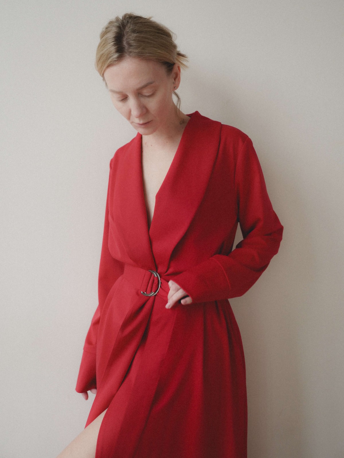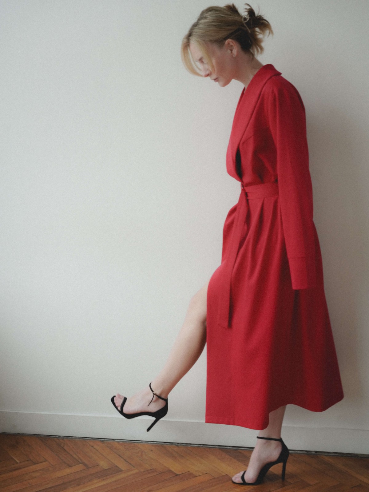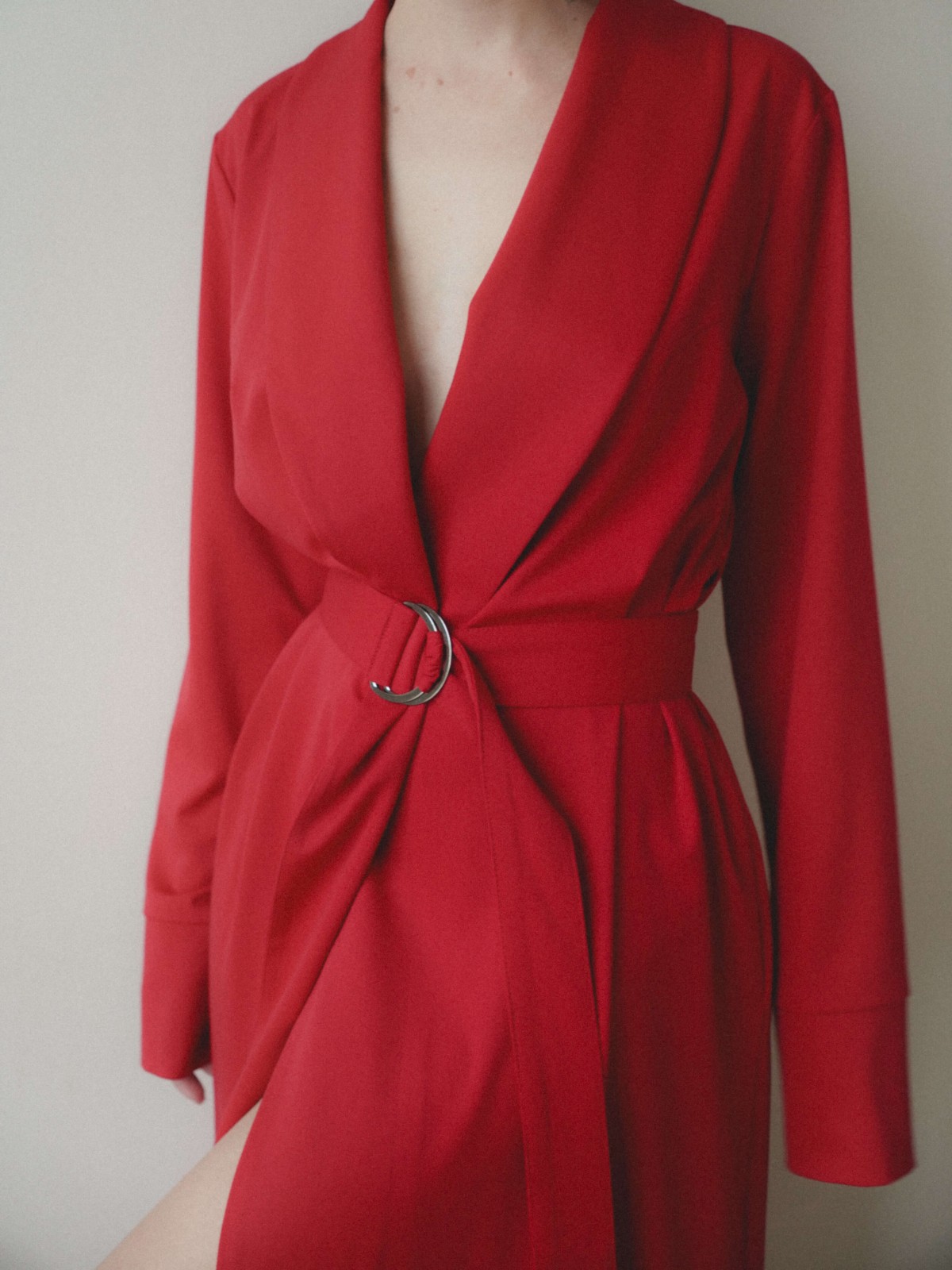 Платье на запах в красном цвете с затягивающимся поясом и вшитыми карманами. Идеальный вариант вечернего платья, создающего шарм и настроение.