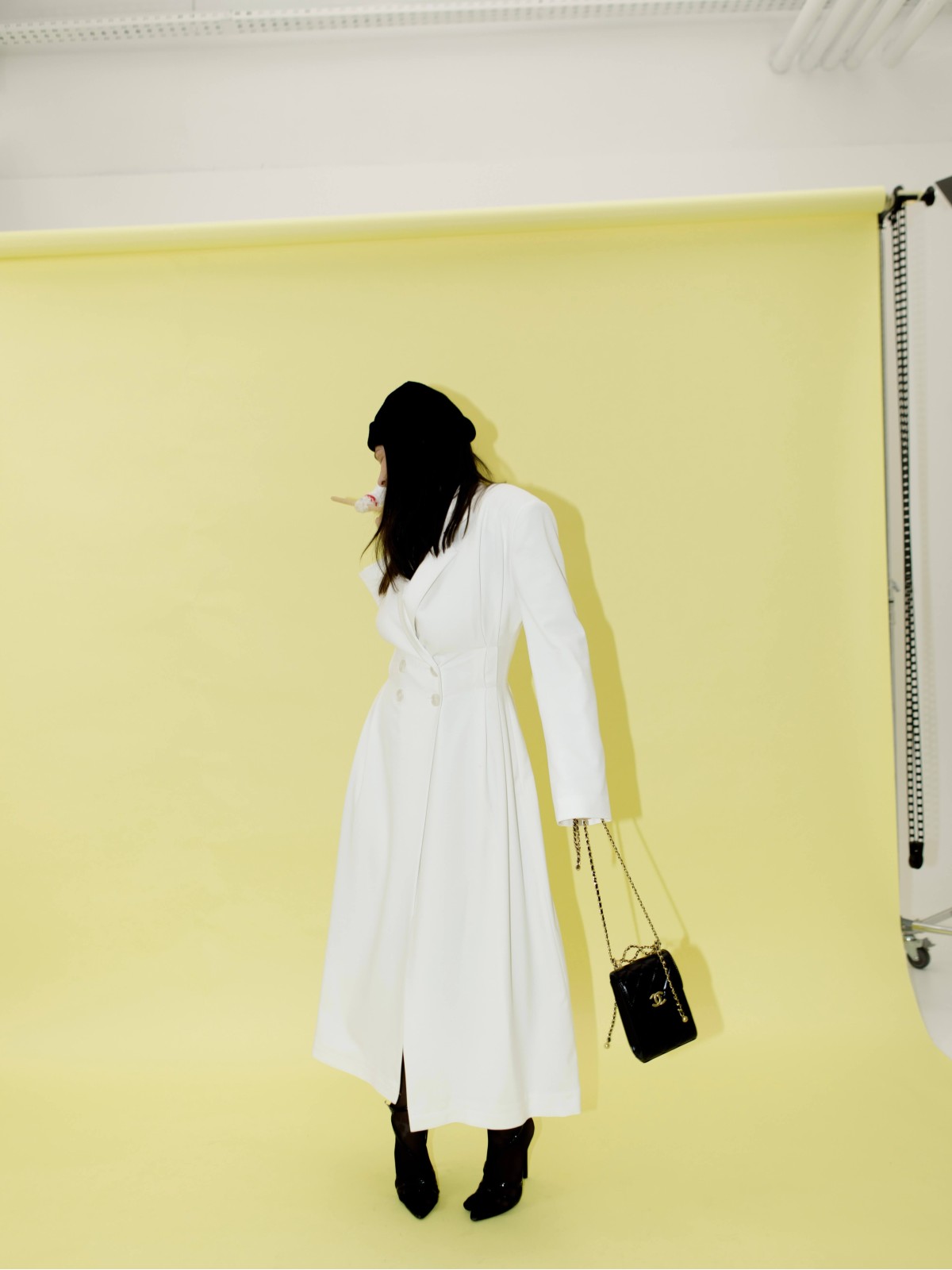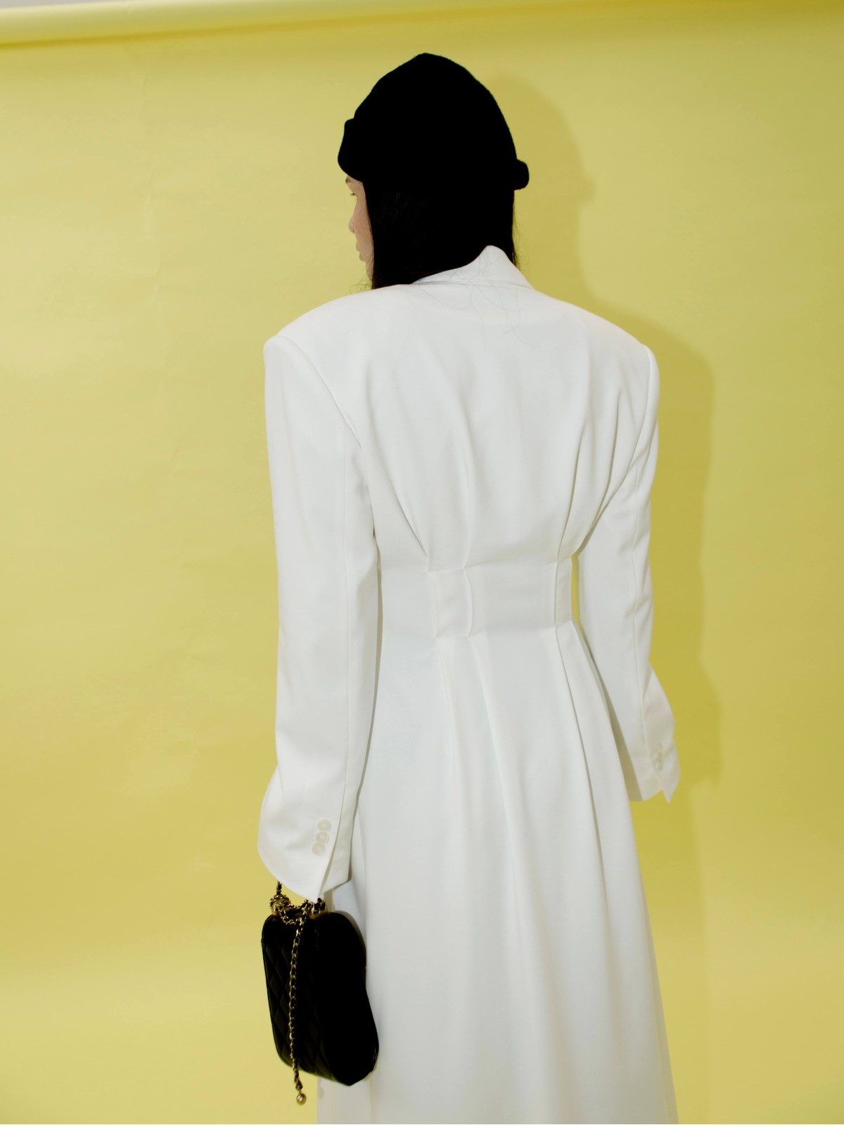 Эффектное платье-жакет для тех, кто любит сочетание элегантности и смелости. Приталенный крой подчёркивает фигуру, а выраженная линия плеч добавляет образу архитектурности. Глубокий разрез спереди делает модель по-настоящему запоминающейся и визуально вытягивает ноги.