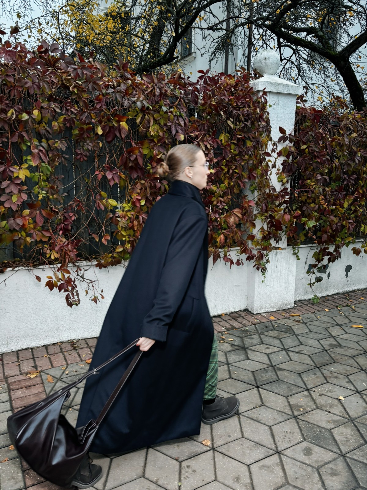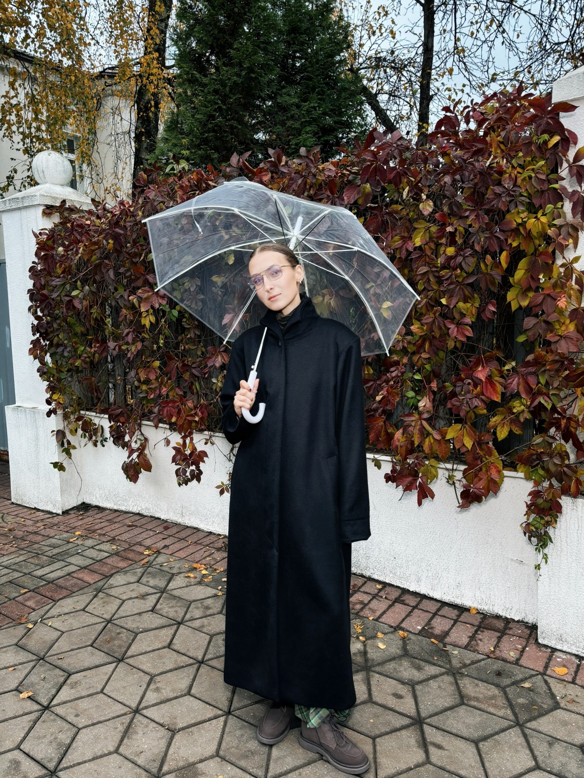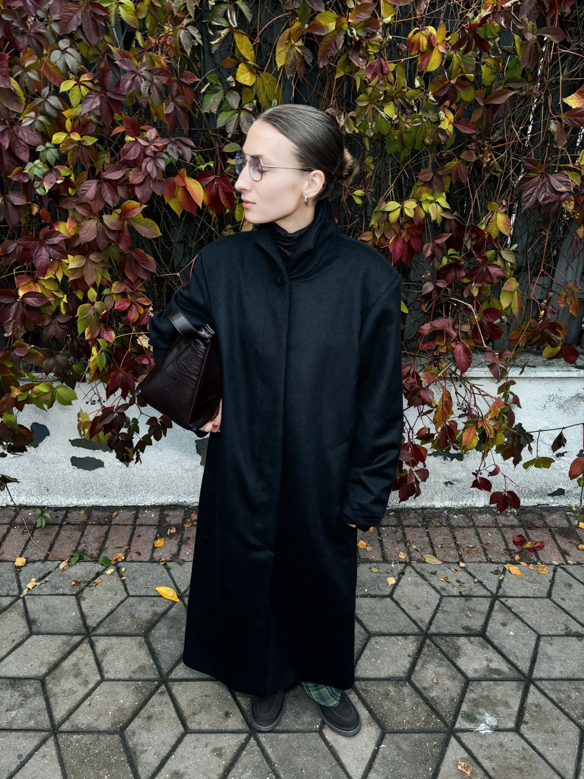 Минималистичное пальто прямого силуэта с мягкой линией плеча и высоким воротником. Плотная шерстяная ткань держит форму, но остаётся пластичной в движении.