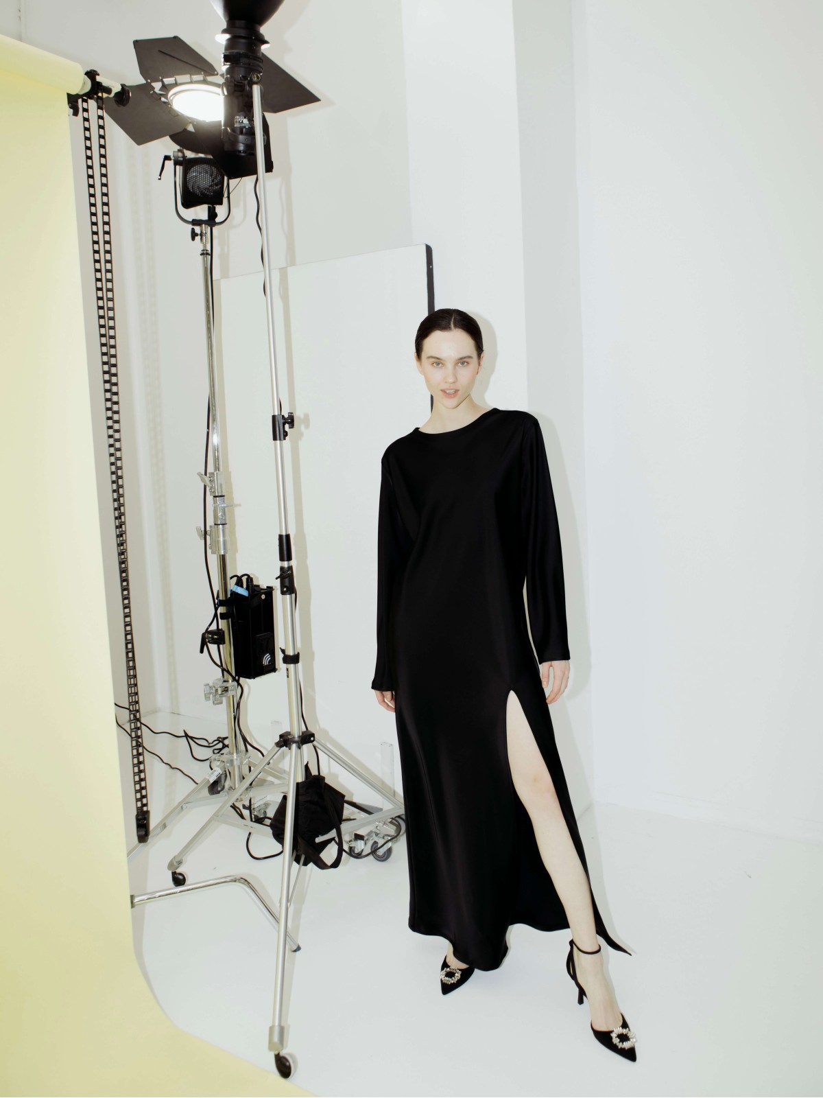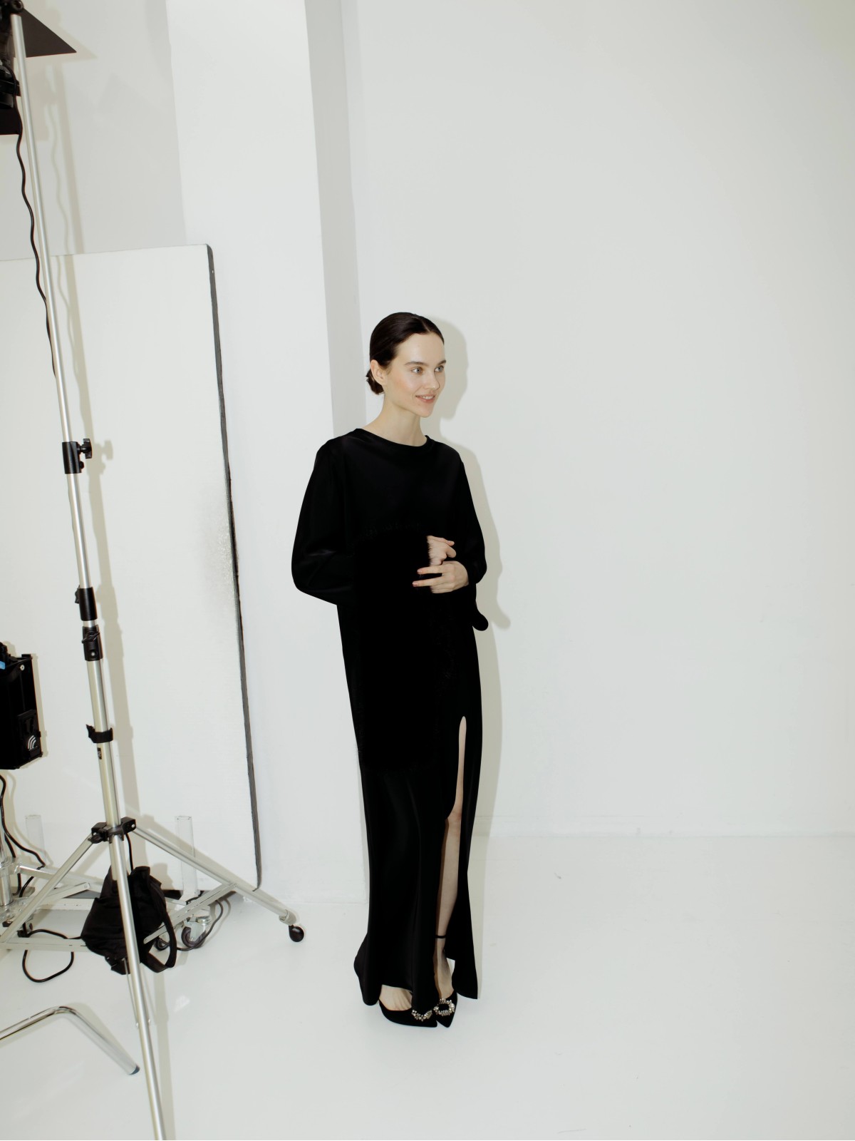 Платье прямого кроя в черном цвете с разрезом. Длина макси, расклешенные рукава, приспущенная линия плеч, U-образный вырез горловины.