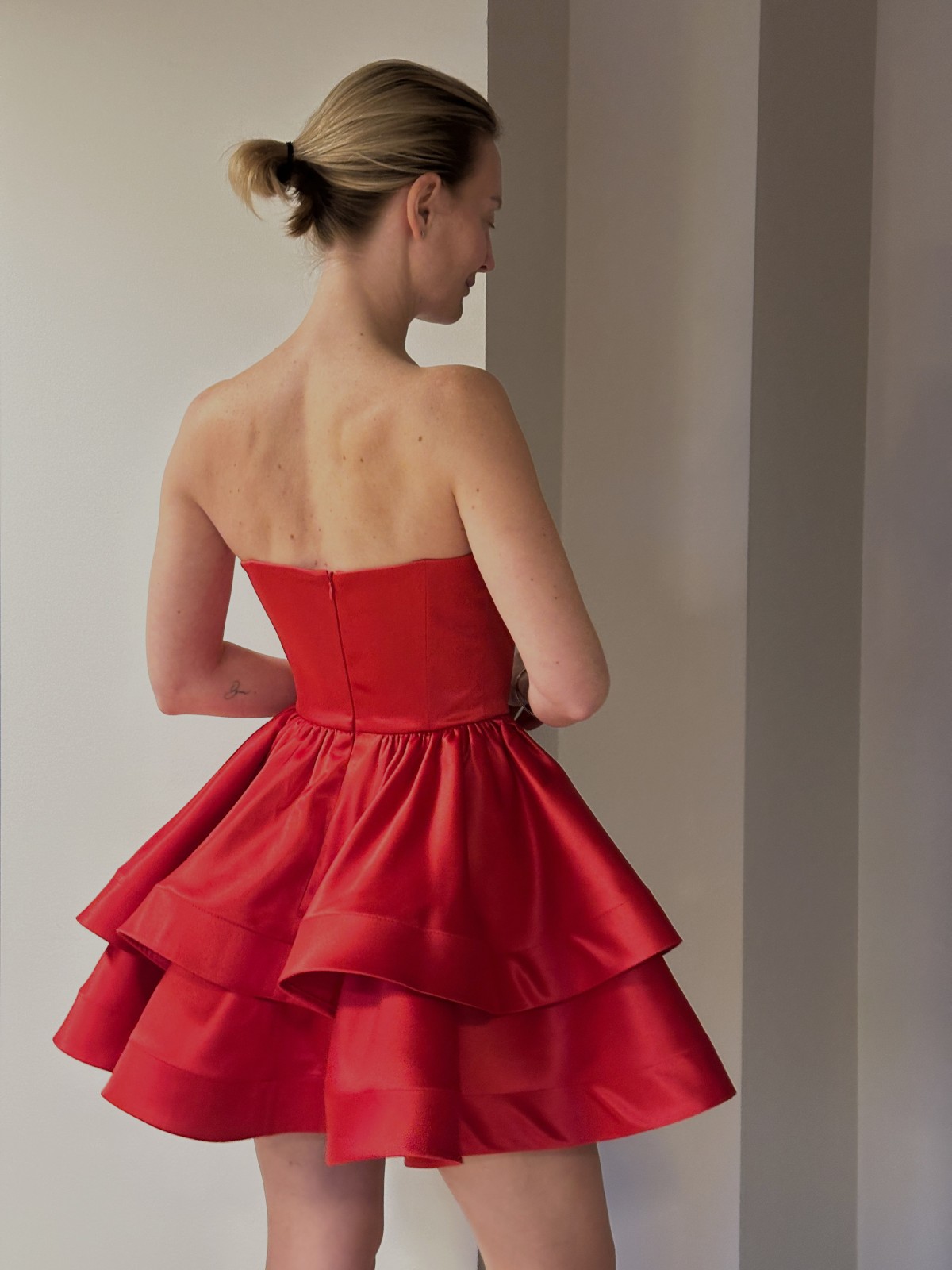 Оно создаёт тот самый «вау-эффект»: открытые плечи, акцентный корсетный верх и многослойная юбка, которая красиво держит форму и даёт выразительный объём. Плотный сатин отражает свет, подчёркивая линии фигуры и добавляя драматичности образу.
