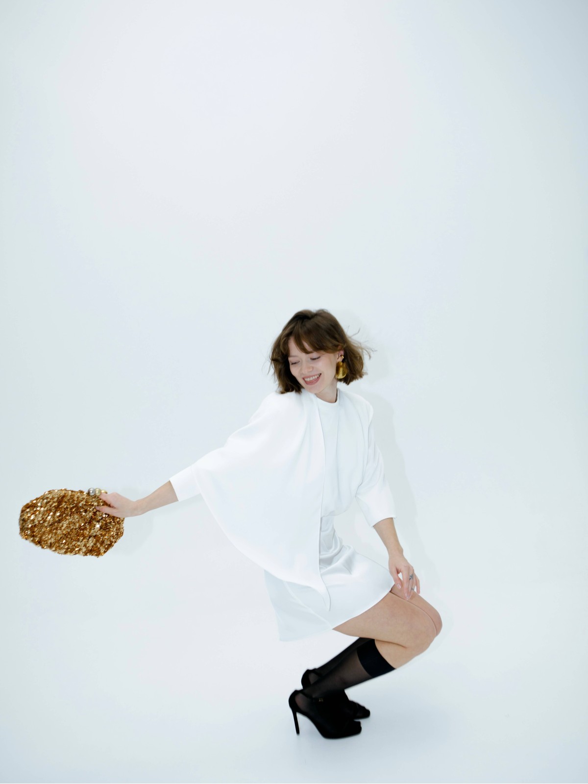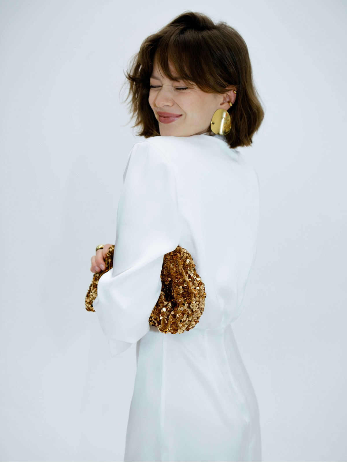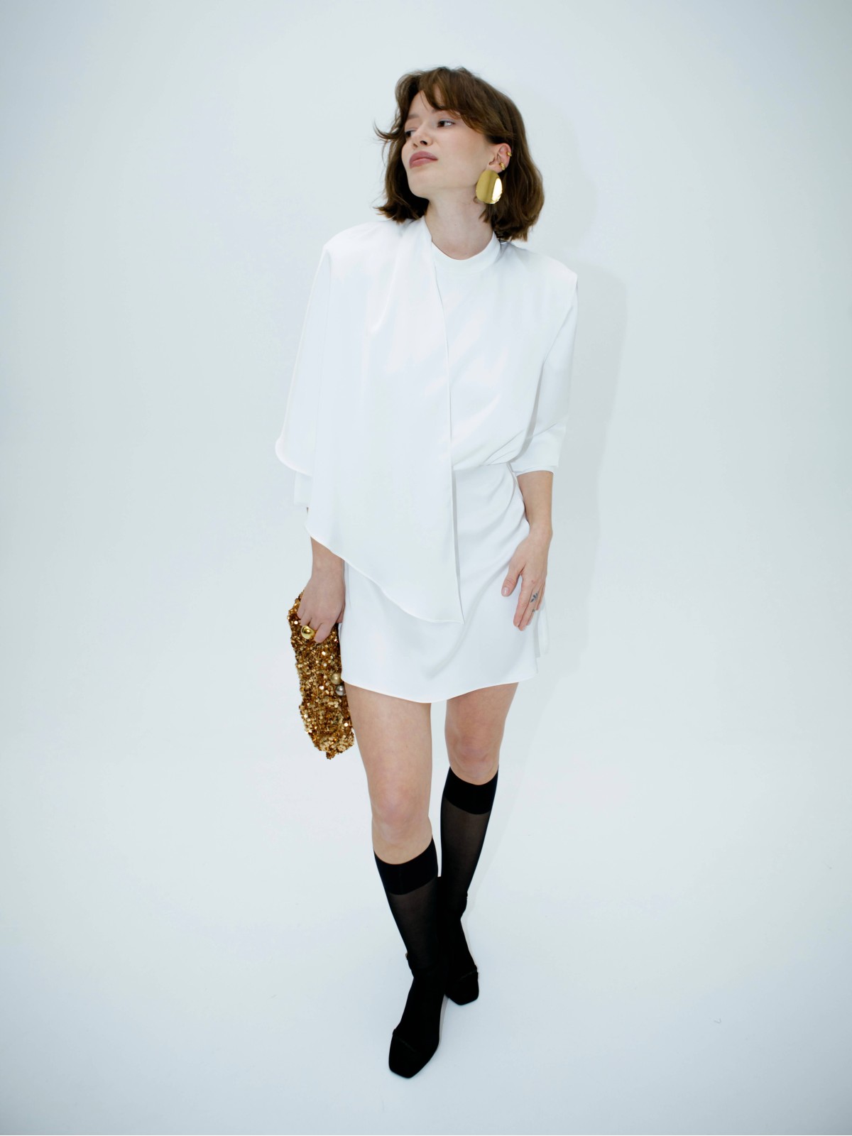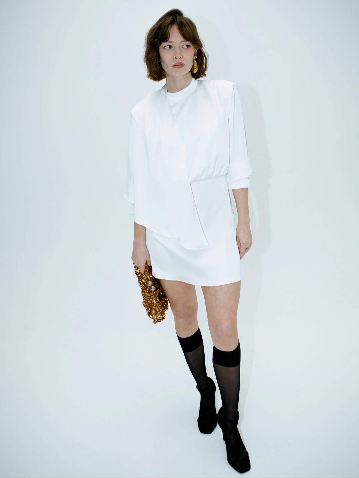 Главный акцент модели — задний шлейф, но платье теперь короче и темпераментнее. Оттенок, блеск и плавность ткани, а длина мини добавляет драйва и молодости образу.