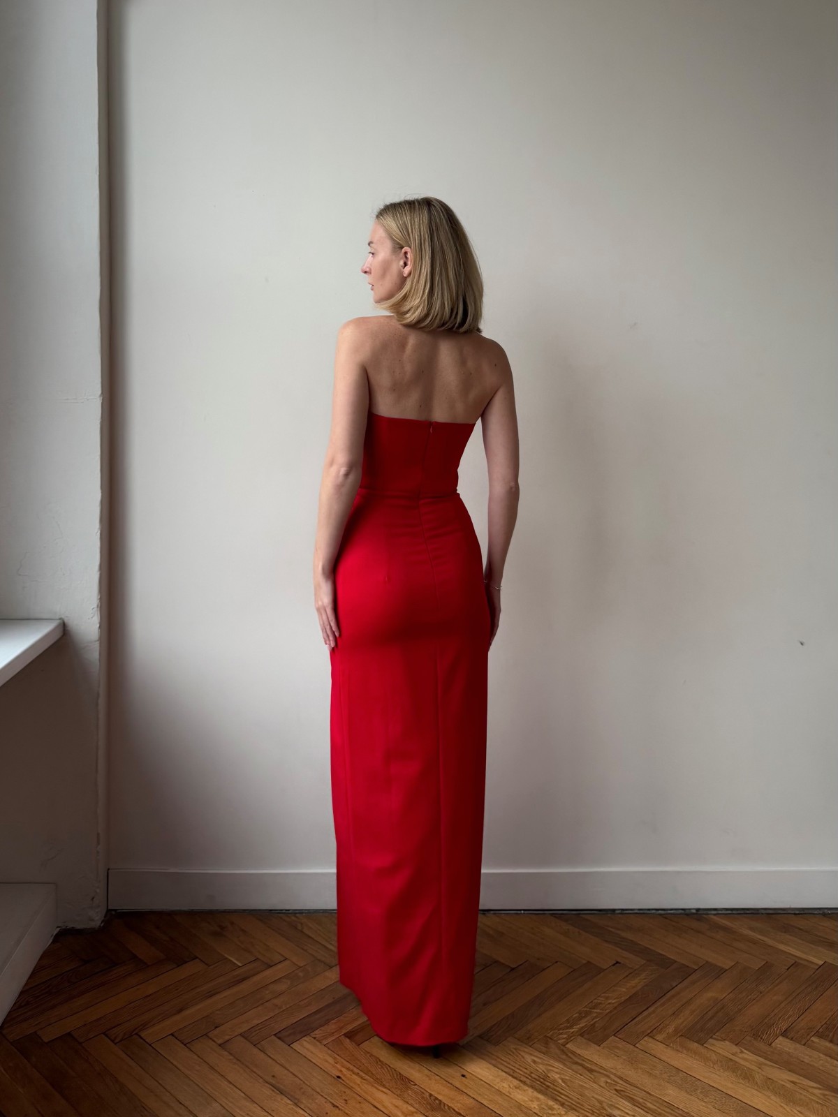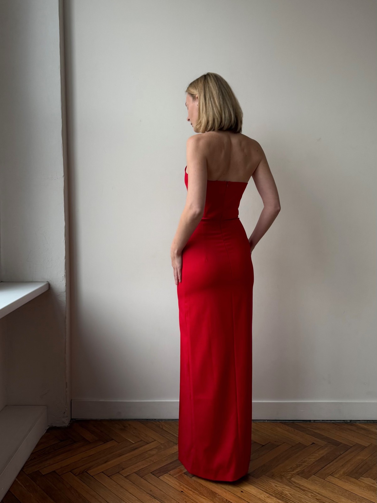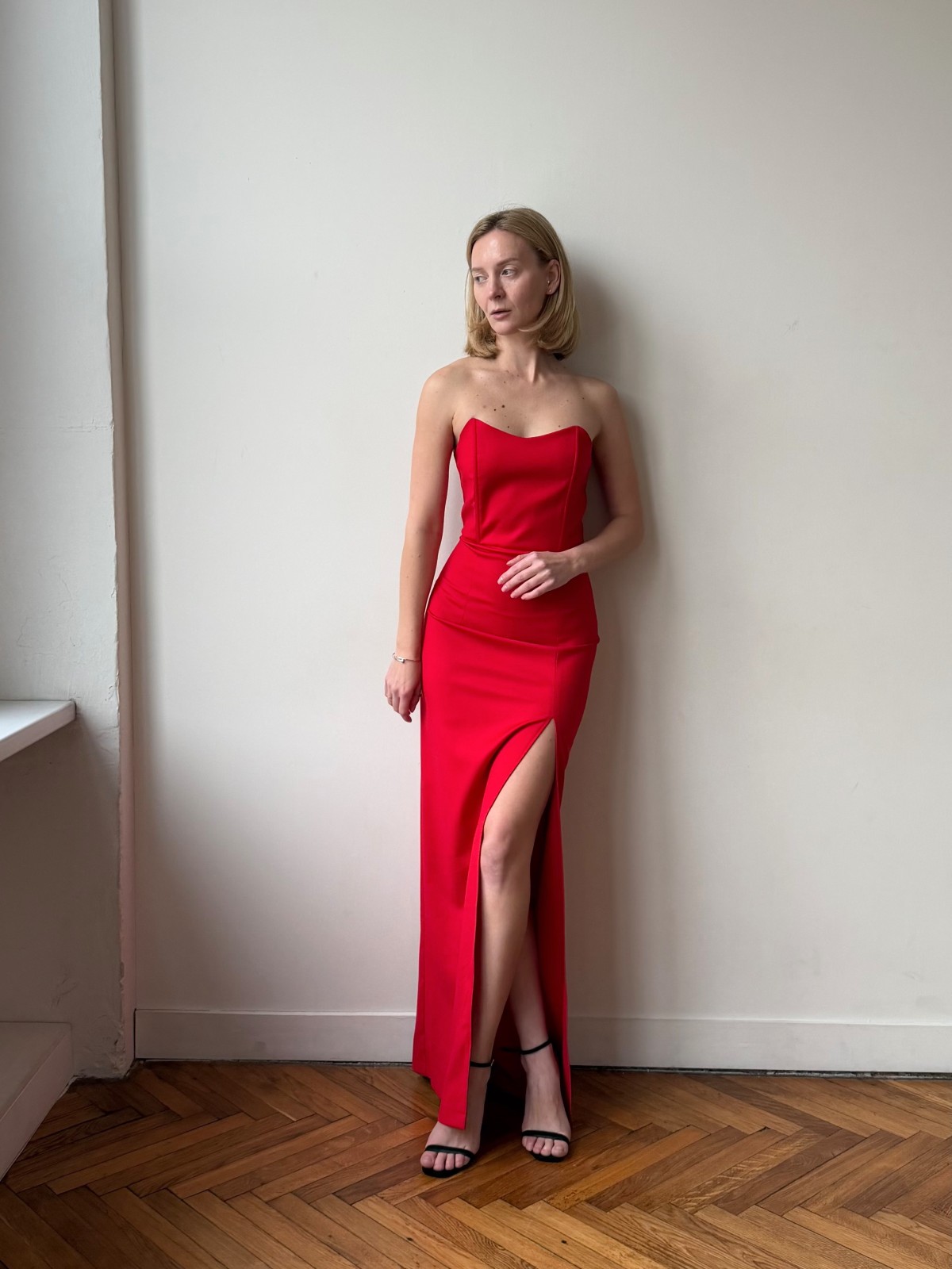 Приталенное платье прямого кроя c корсетным верхом. Длина макси, разрез по линии ноги, замок по линии спины.Состав и уход:60% вискоза, 40% полиэстер - щадящая чистка - стирка запрещена - не отбеливать- нельзя отжимать и сушить