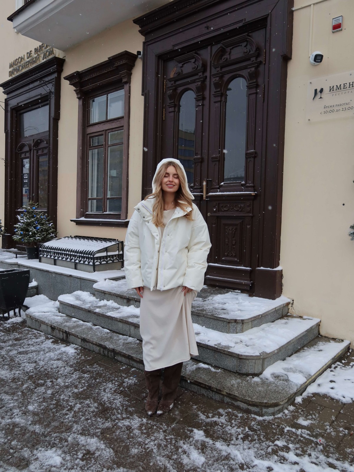 Молочный пуховик с наполнителем синтепух плотностью 250 г. Наполнитель равномерно распределён по всему изделию, поэтому пуховик хорошо держит тепло и комфортен в носке. Модель рассчитана на холодную погоду и подходит для температур до −20 °C. Отличный вариант для зимы — тёплый, лёгкий и практичный.