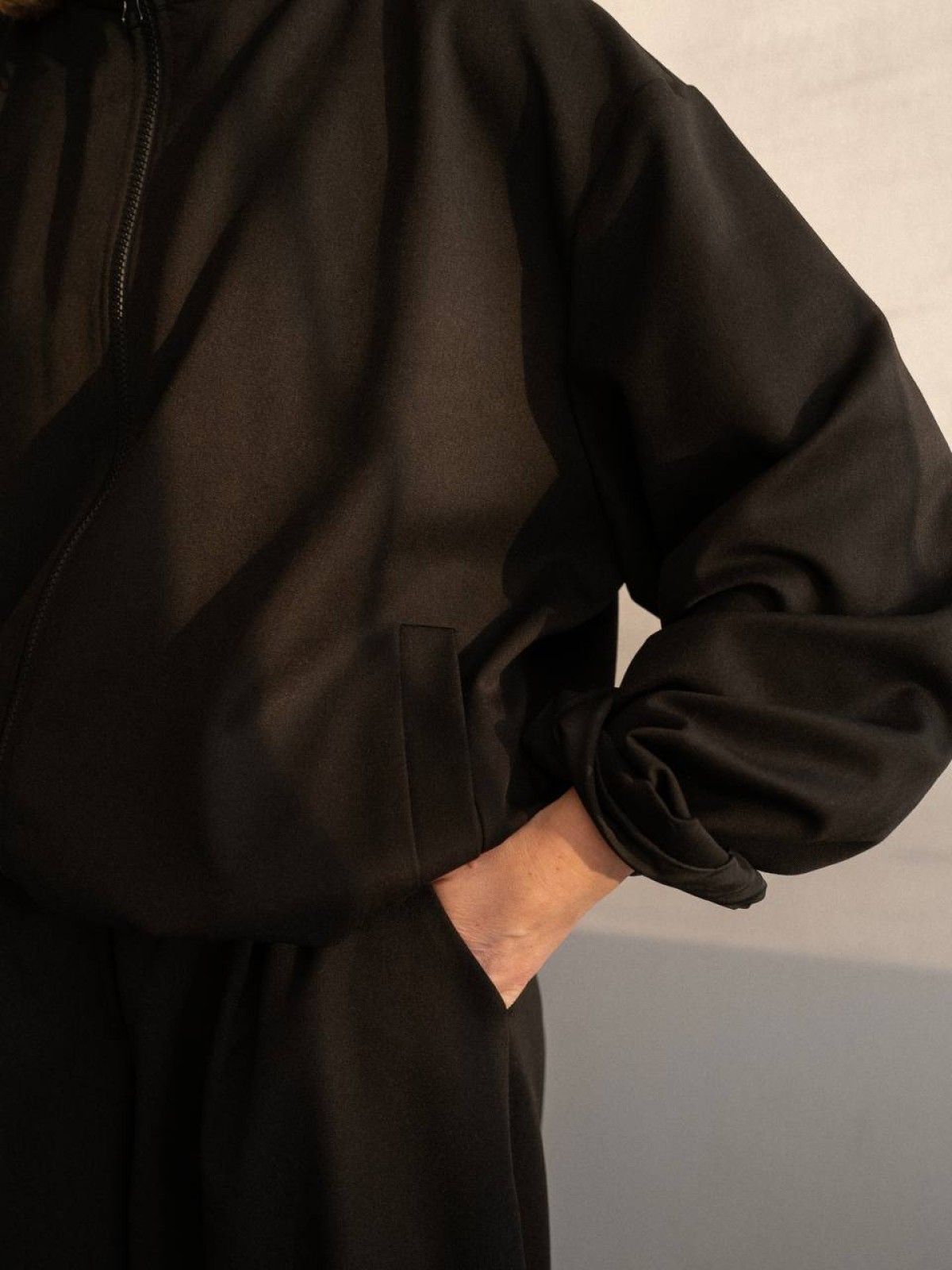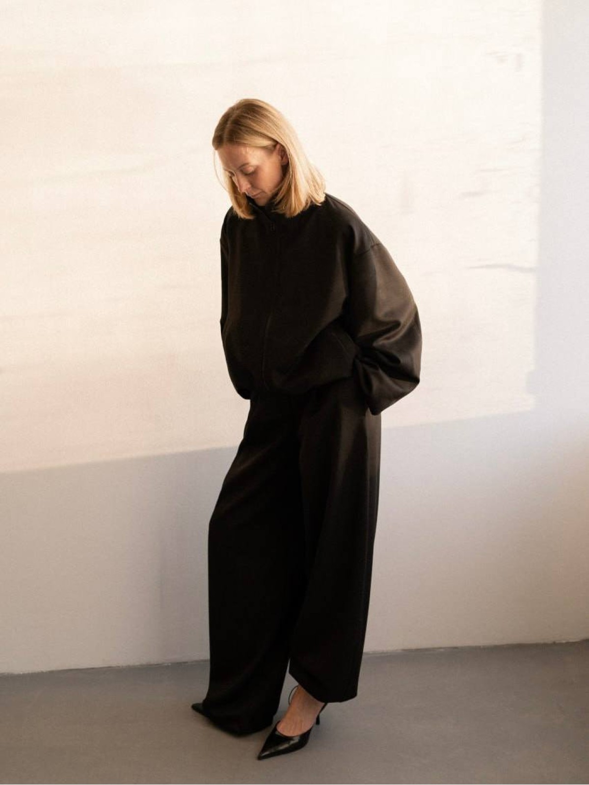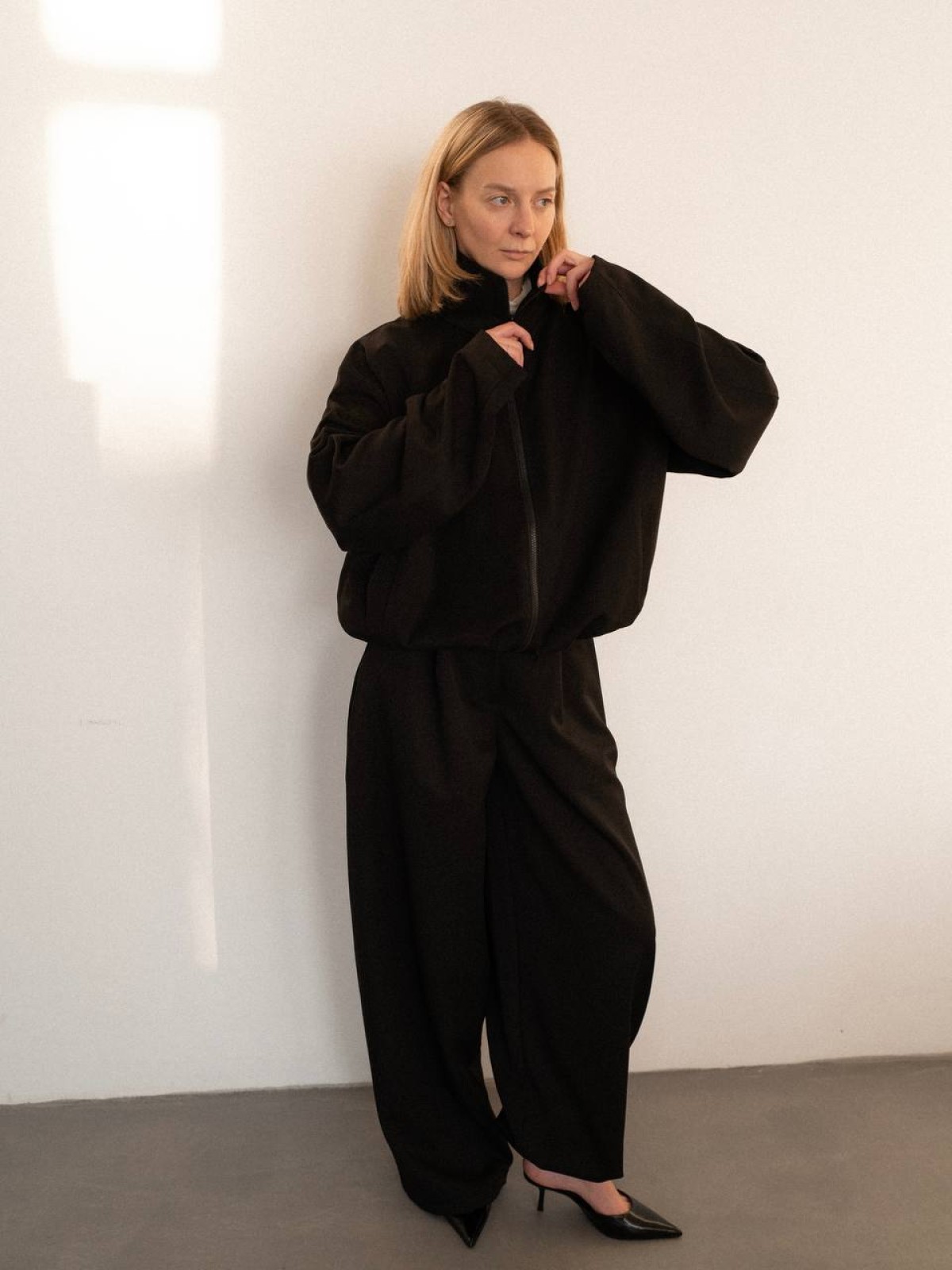Короткая олимпийка на молнии с высоким воротником формирует чёткий, современный силуэт и легко стилизуется слоями. Прямые брюки с кулиской внизу мягко ложатся по фигуре и при необходимости легко трансформируются в брюки-алладины, сохраняя свободу движения и лёгкость образа.