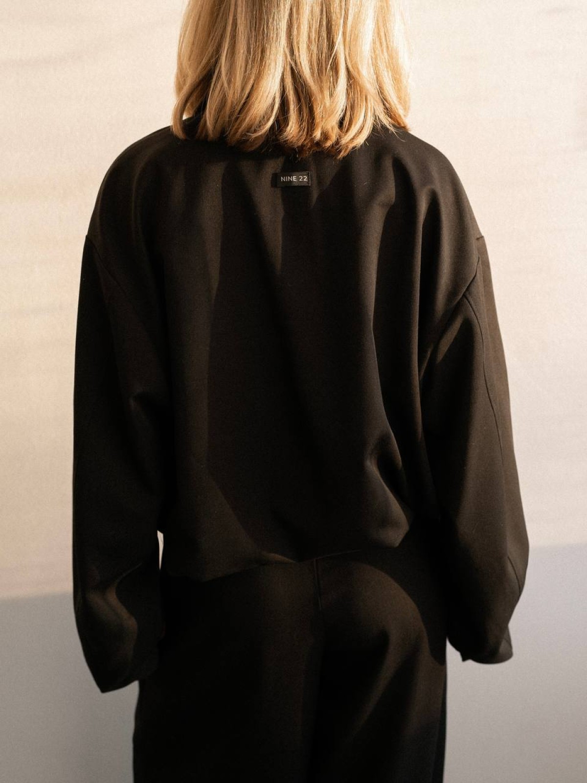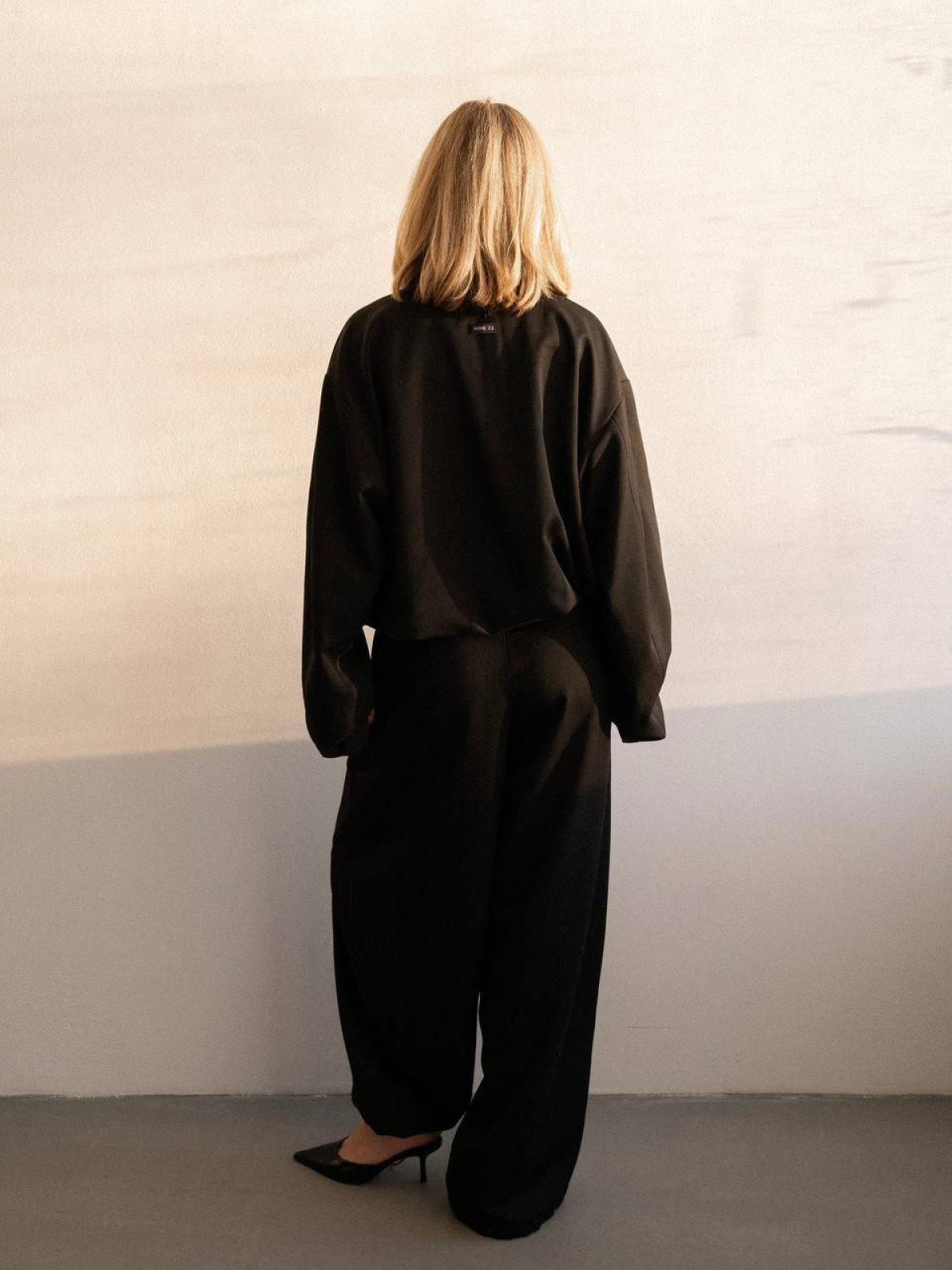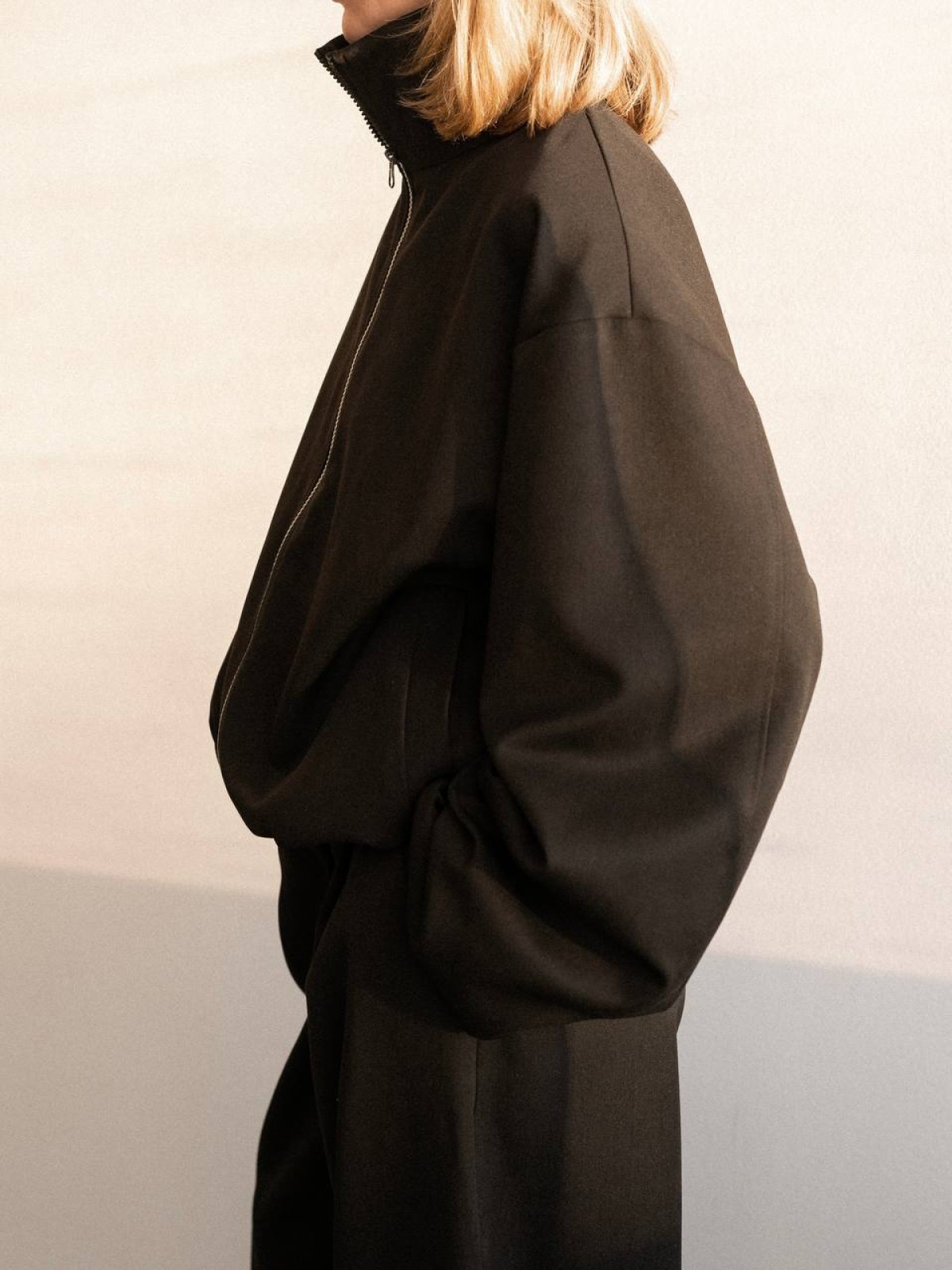 Короткая олимпийка на молнии с высоким воротником формирует чёткий, современный силуэт и легко стилизуется слоями. Прямые брюки с кулиской внизу мягко ложатся по фигуре и при необходимости легко трансформируются в брюки-алладины, сохраняя свободу движения и лёгкость образа.