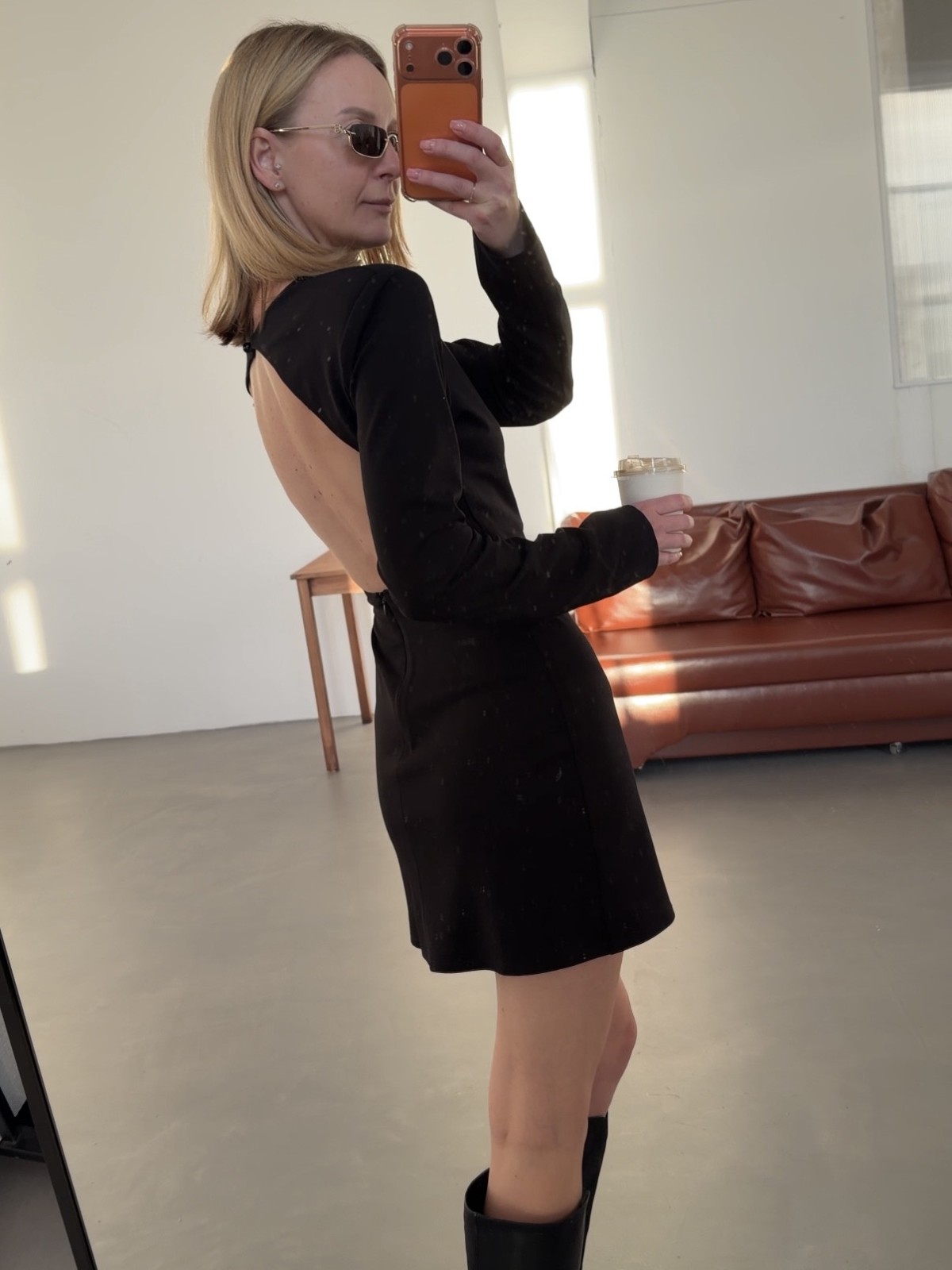 Чёткая линия плеч, длинный рукав и глубокий вырез на спине создают баланс между строгостью и чувственностью. Платье подчёркивает фигуру, визуально вытягивает силуэт и делает акцент на спине — без лишних деталей.