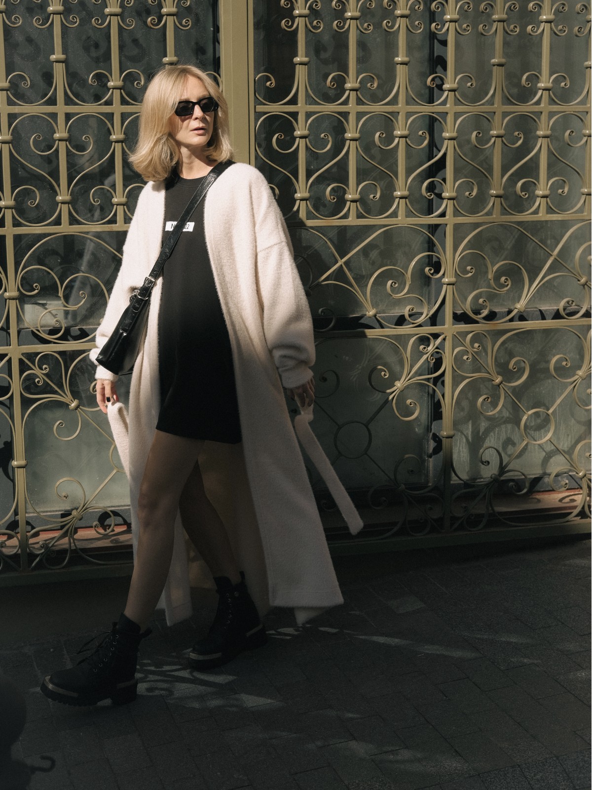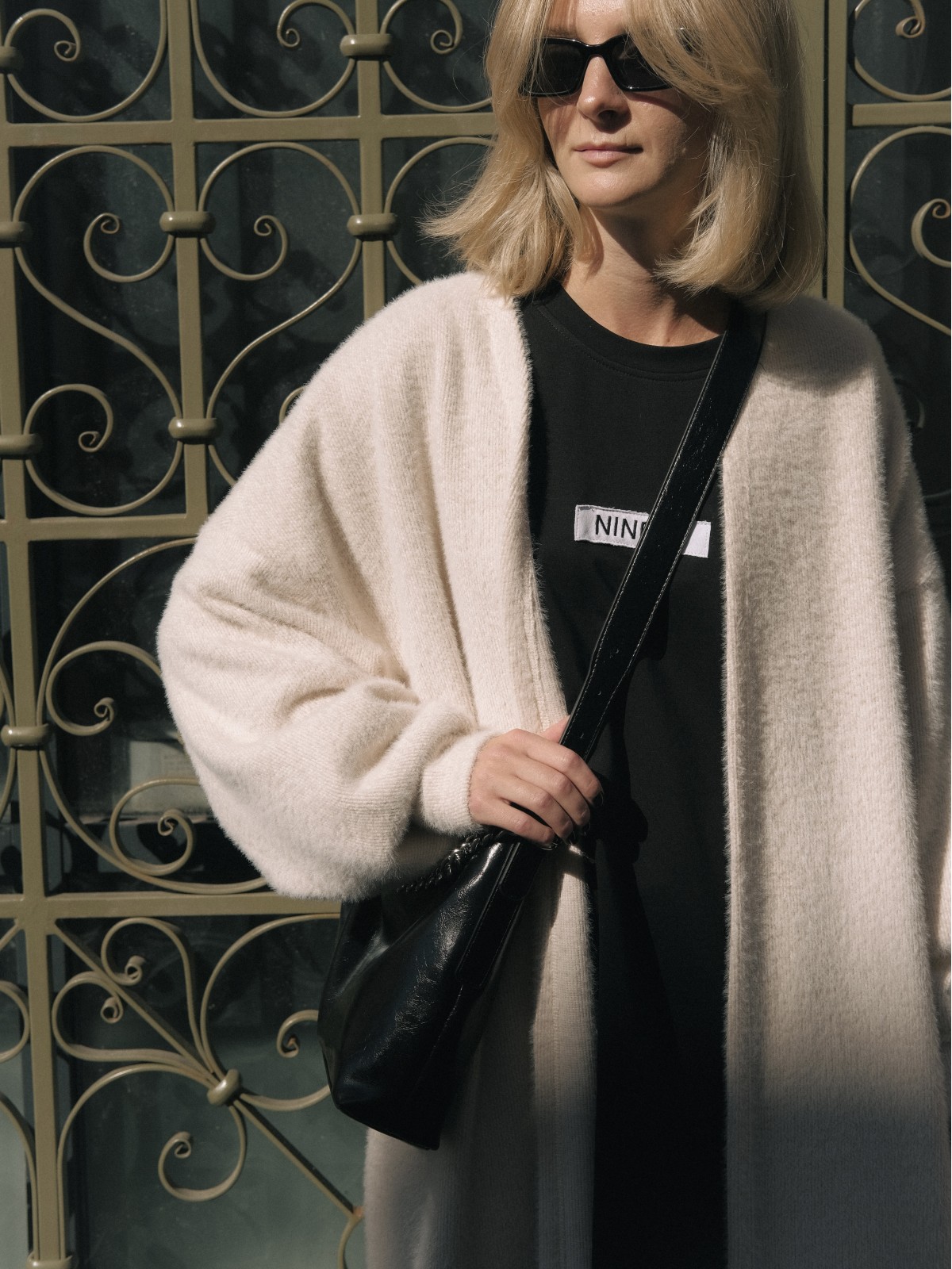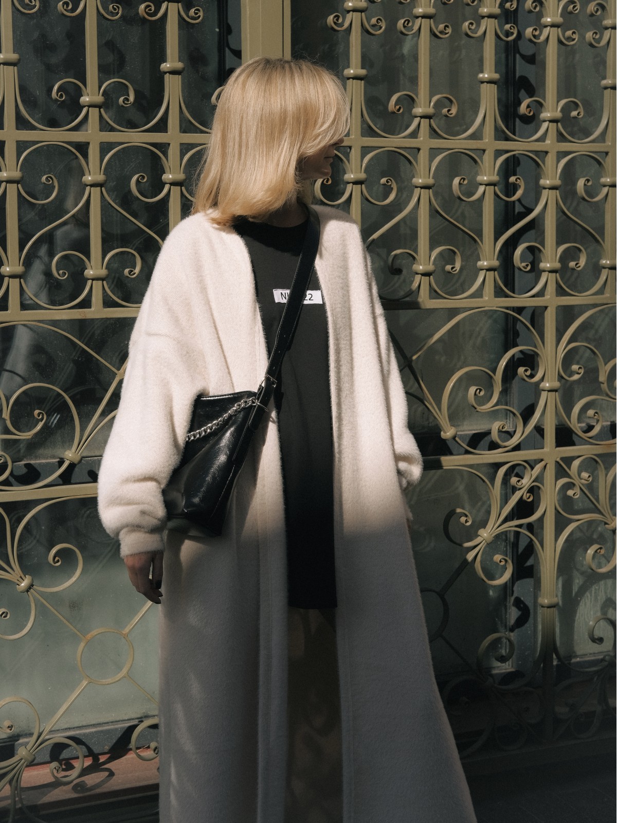 Удлиненный кардиган с поясом и спущенной линией плеч. Объемные рукава и уплотнения в районе запястья.