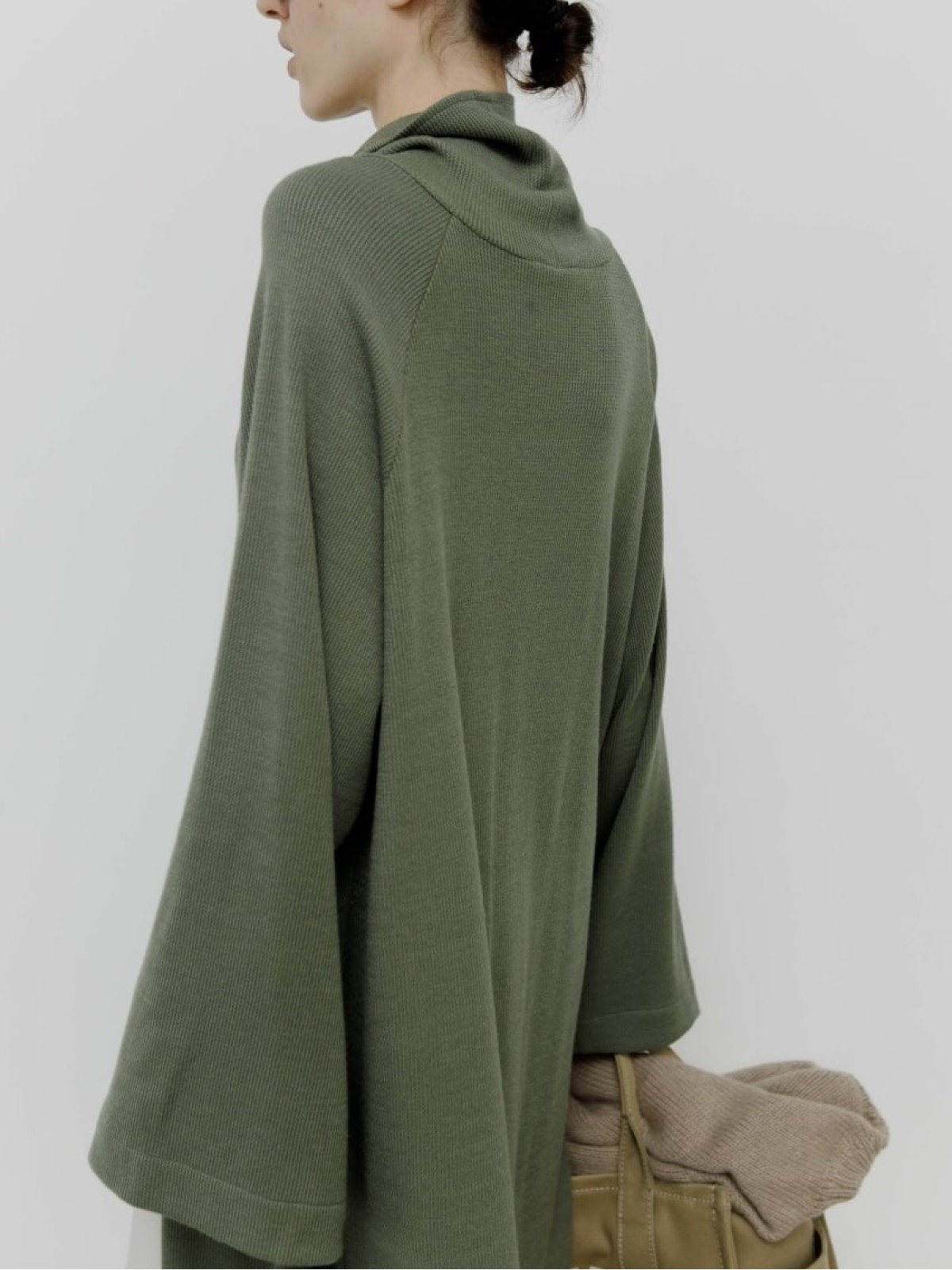 Свитер дополнен высоким горлом и отлично дополнит образы с юбкой, брюками и леггинсами.
