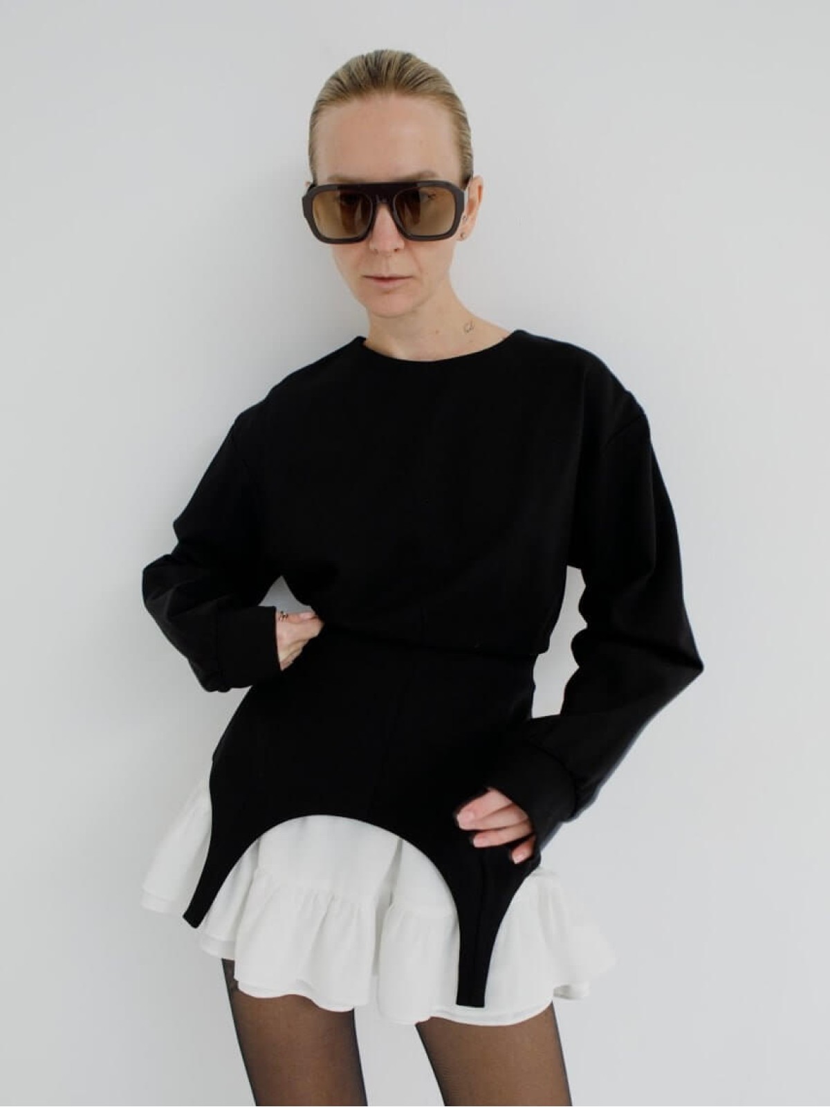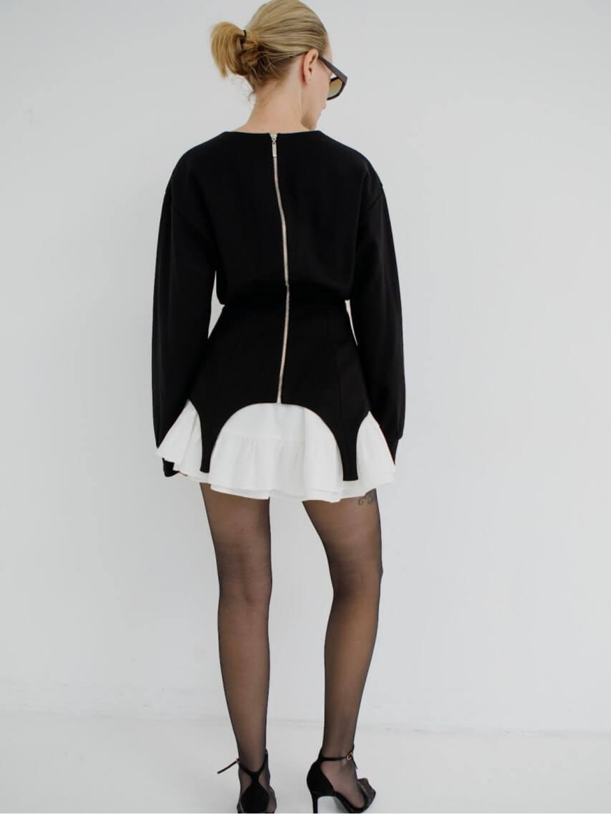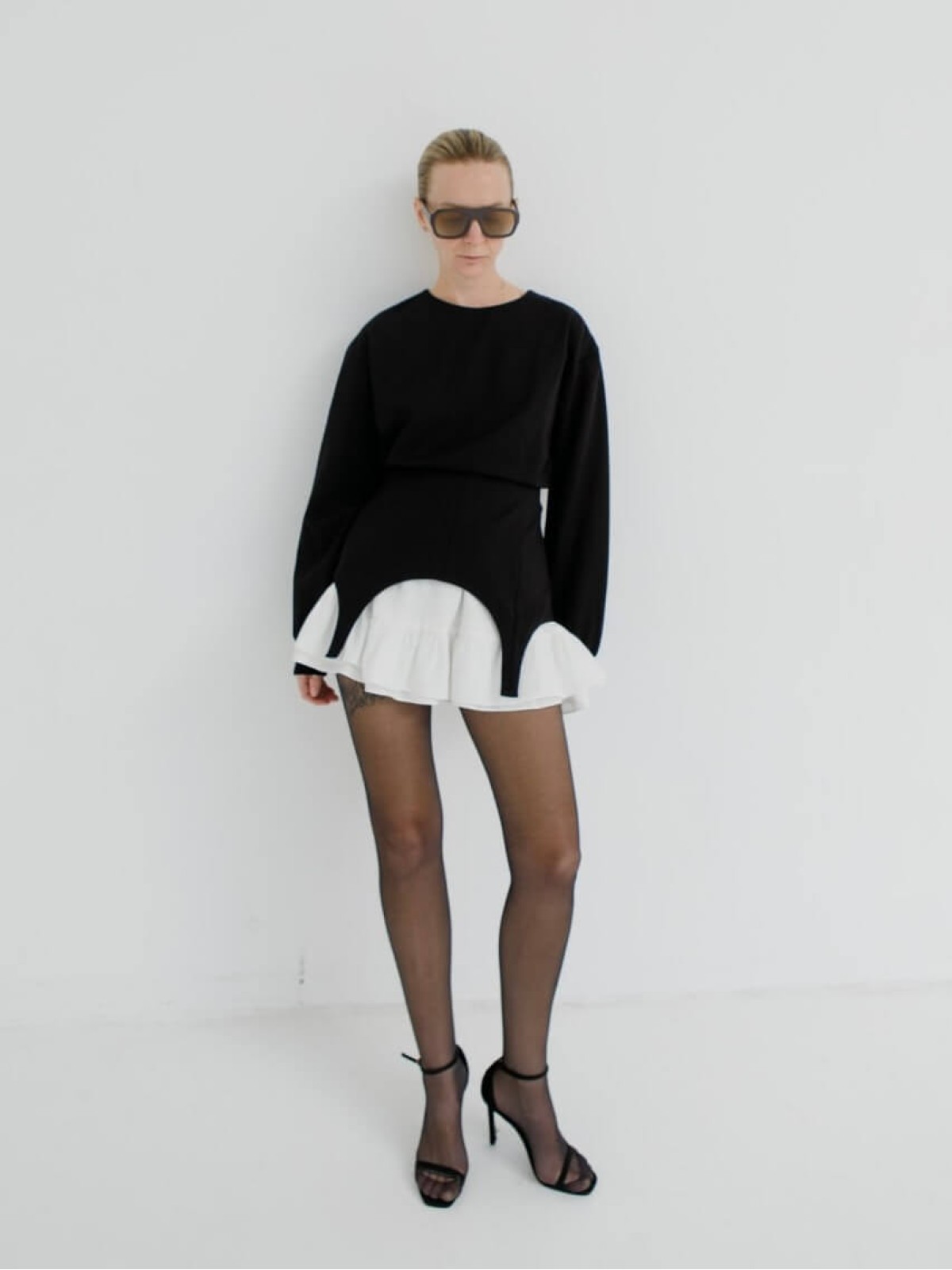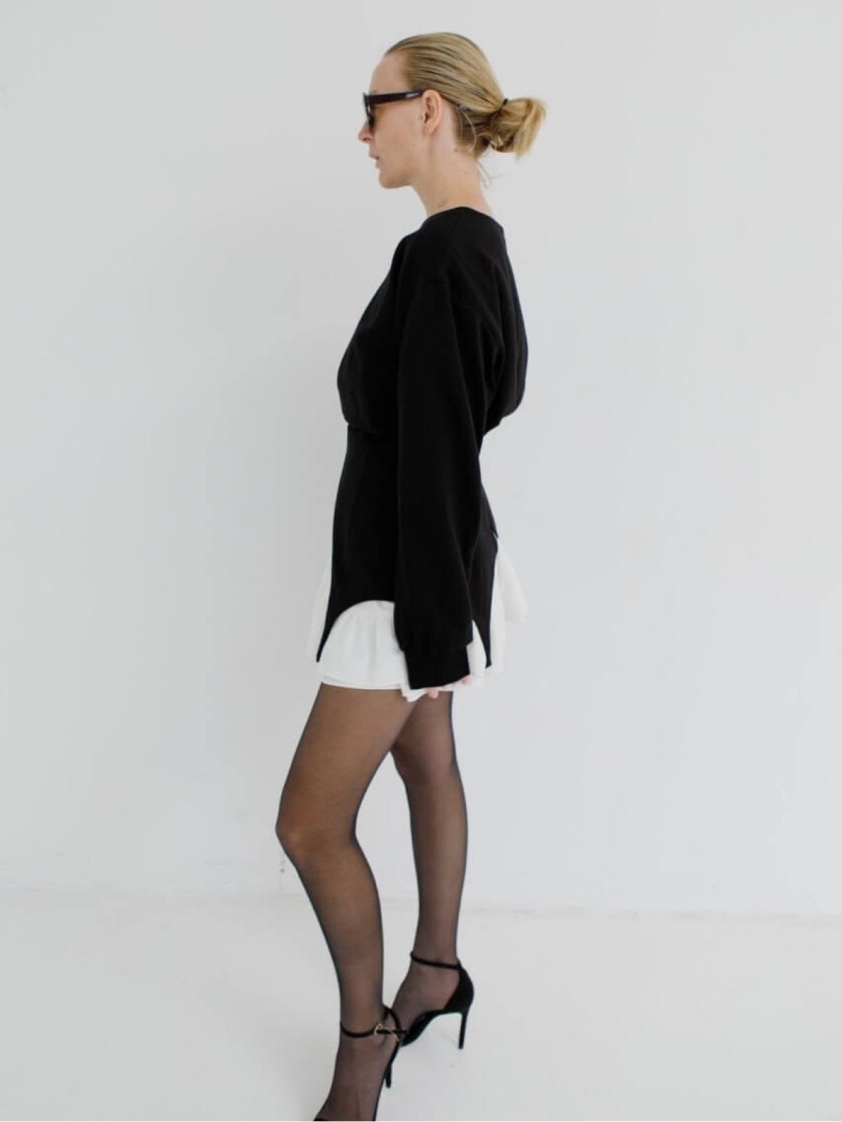 Свитшот с ассиметричным низом и замком по всей длине сзади, который можно комбинировать с остальными вещами в гардеробе, создавая образы под разное настроение. Идеальное дополнение к юбкам, джинсам и брюкам.
