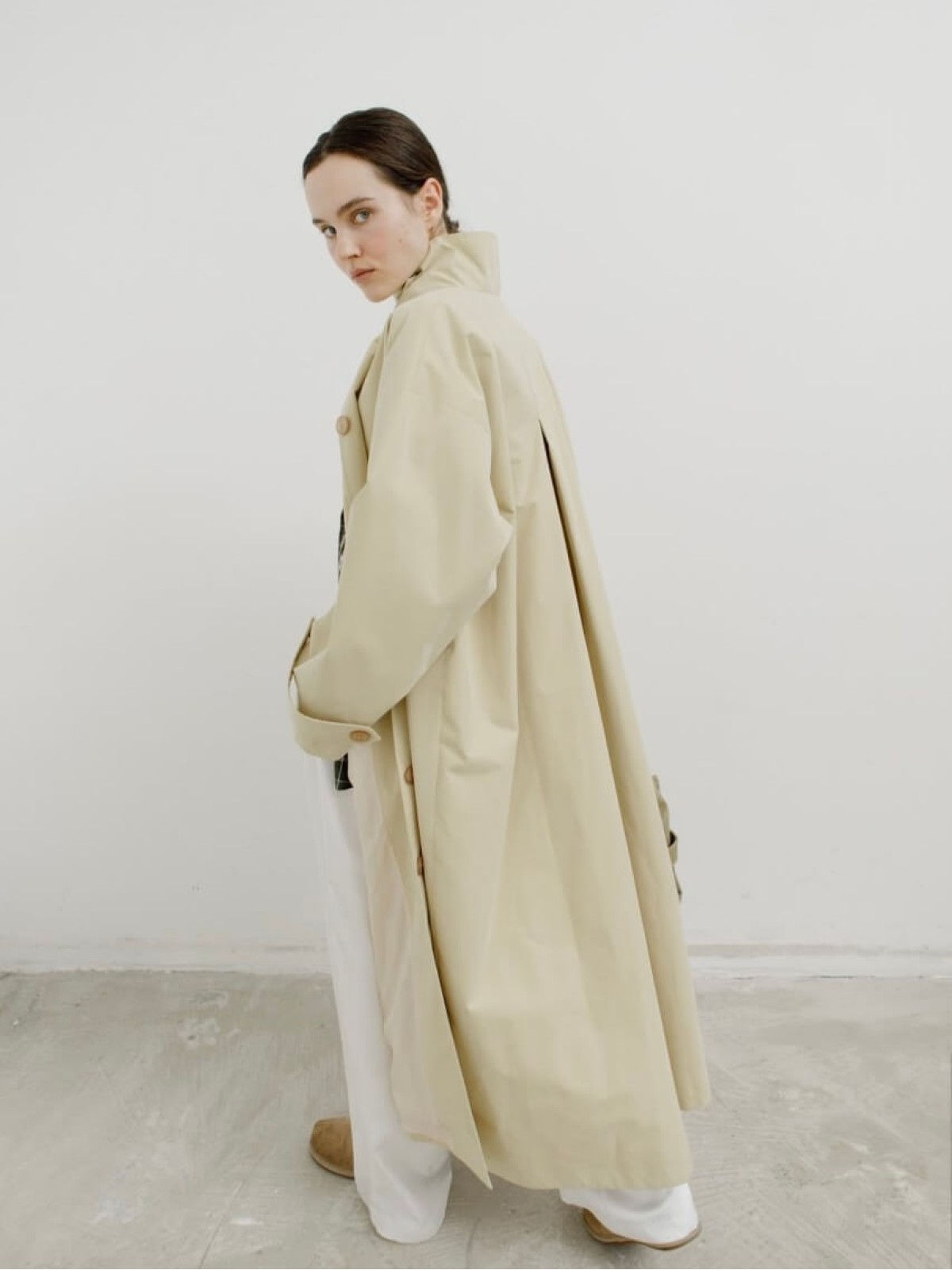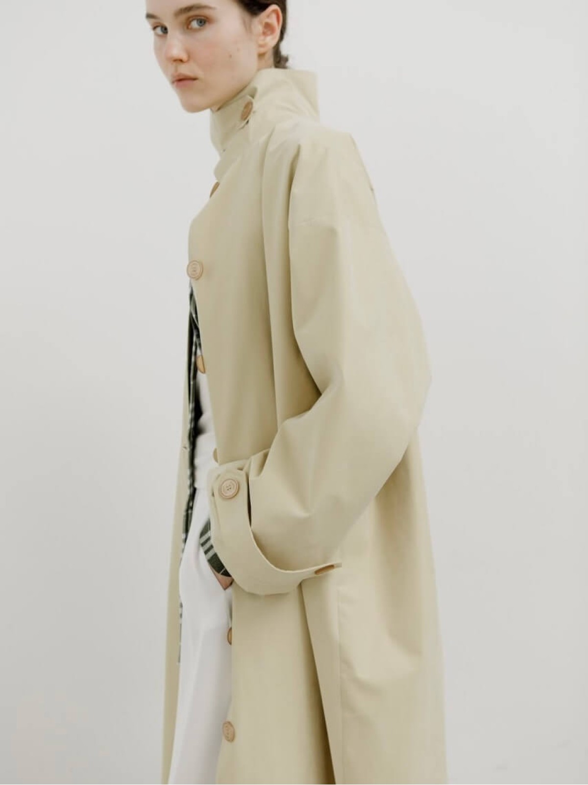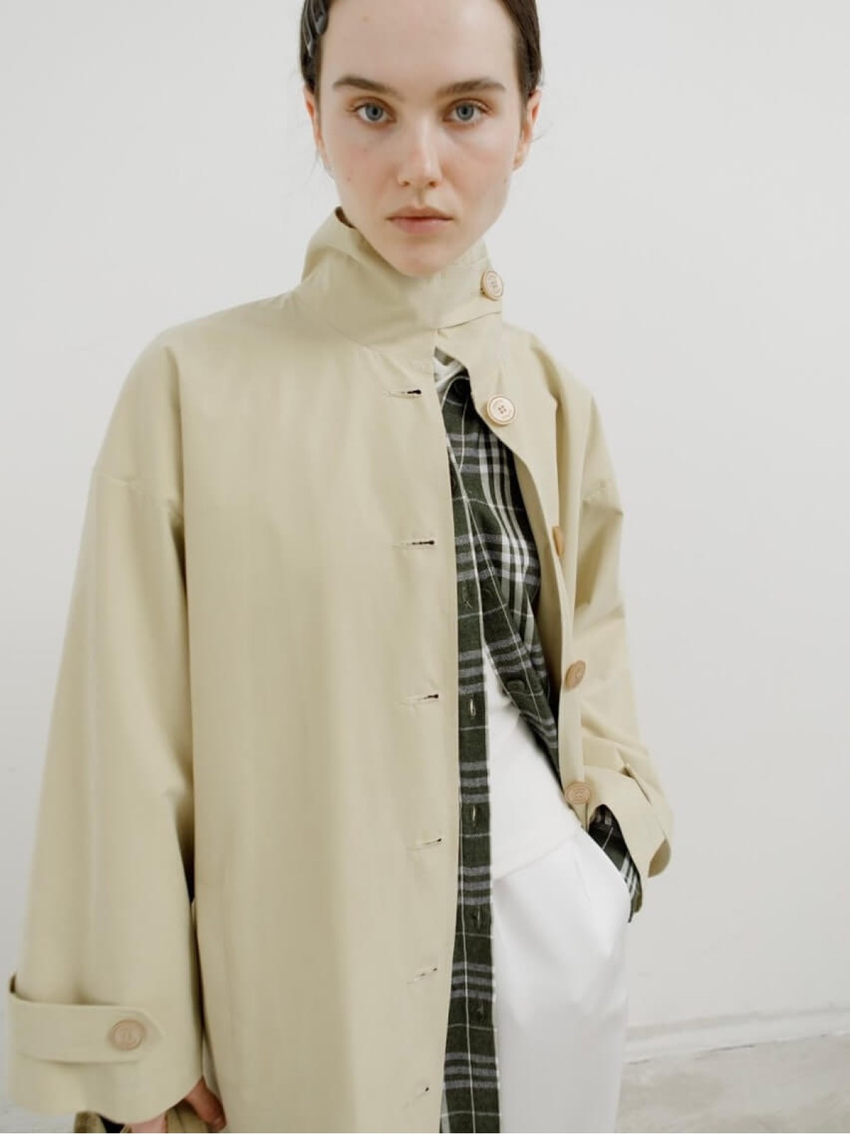 Модель выполнена из легкой ткани, которая защищает от ветра и дождя и отличается лаконичным кроем с высоким воротом-стойкой. Длина миди и свободный силуэт делают тренч универсальным: он одинаково органично смотрится и с платьем, и с брюками.