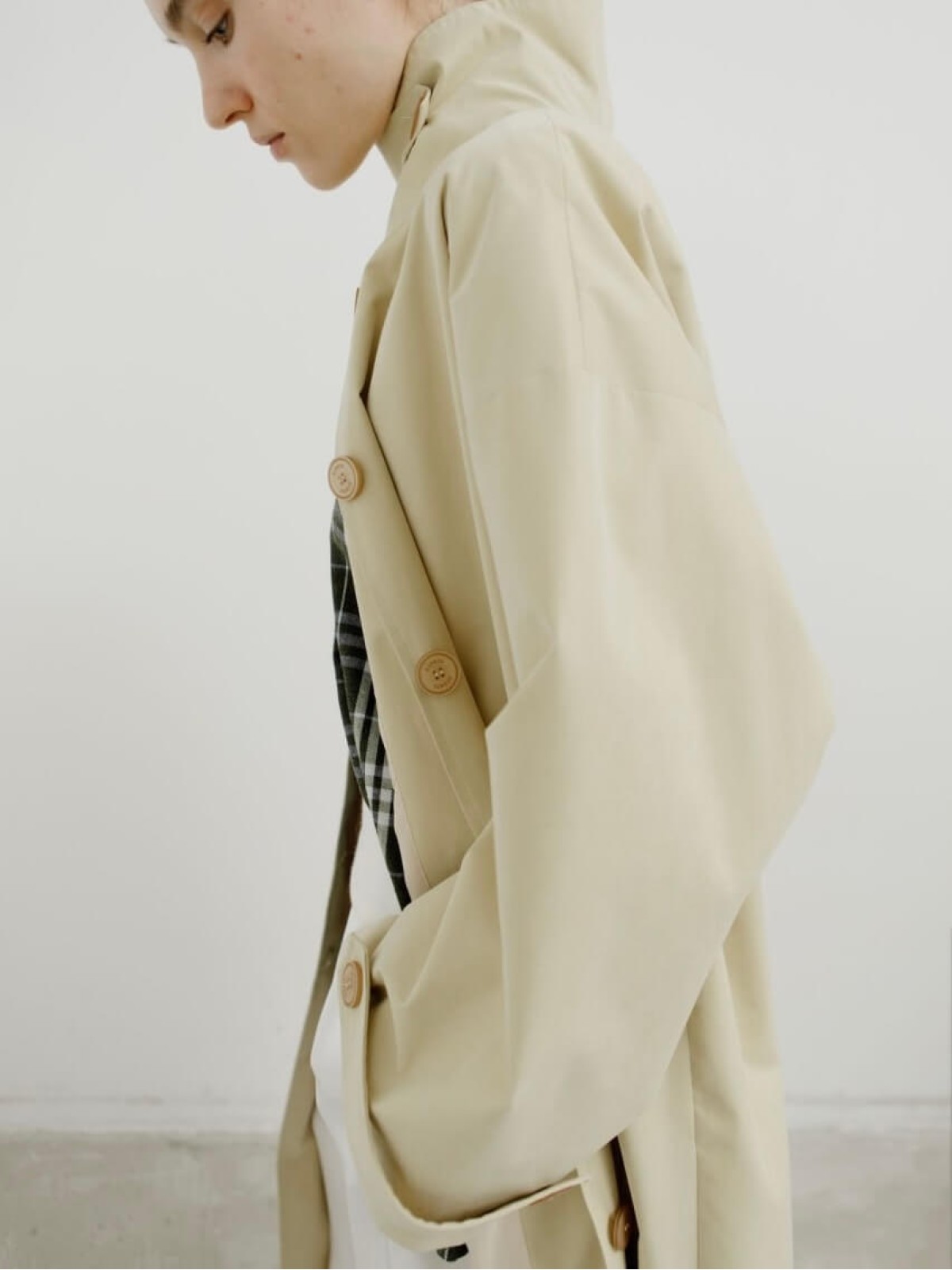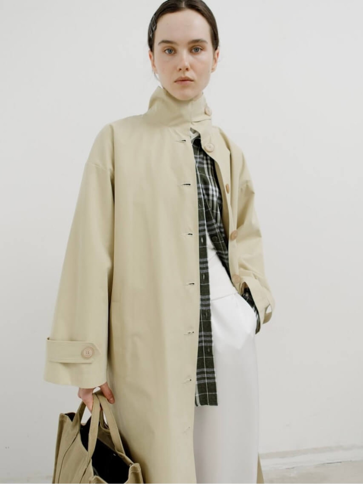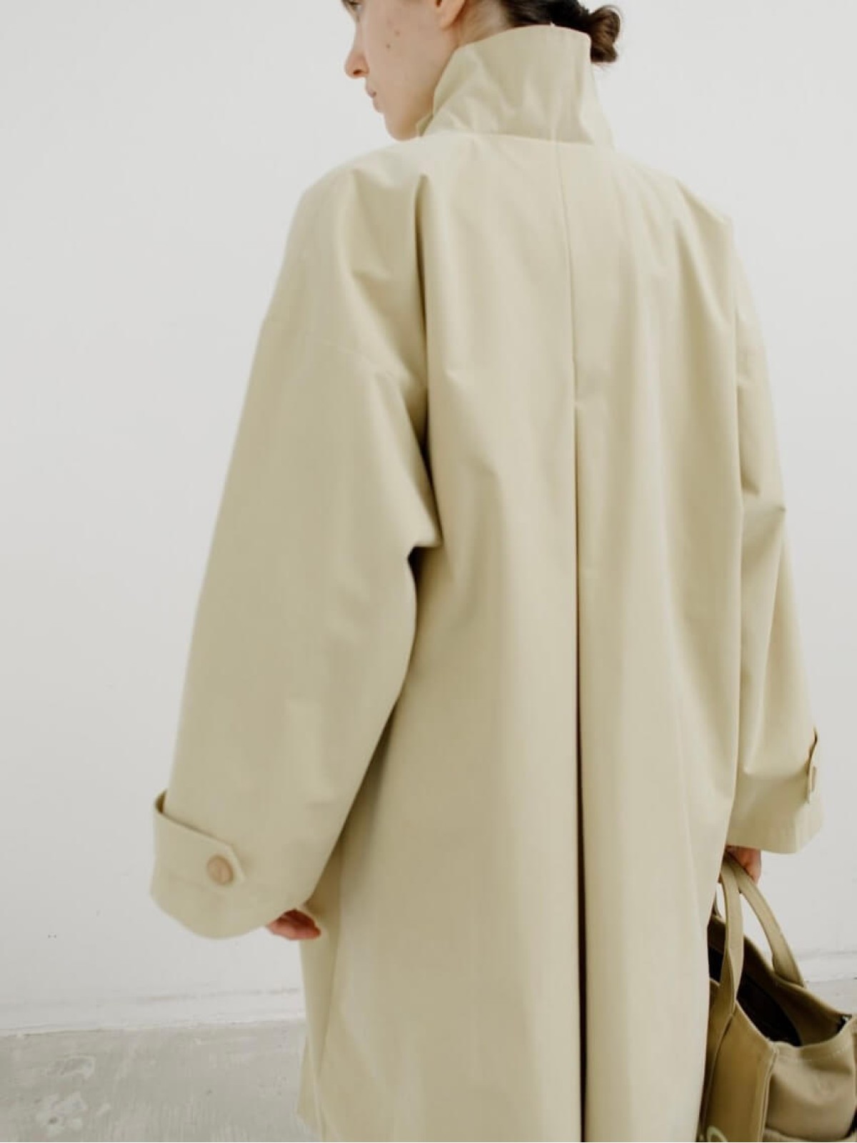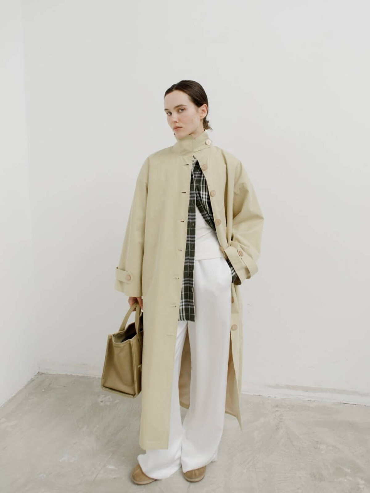 Модель выполнена из легкой ткани, которая защищает от ветра и дождя и отличается лаконичным кроем с высоким воротом-стойкой. Длина миди и свободный силуэт делают тренч универсальным: он одинаково органично смотрится и с платьем, и с брюками.