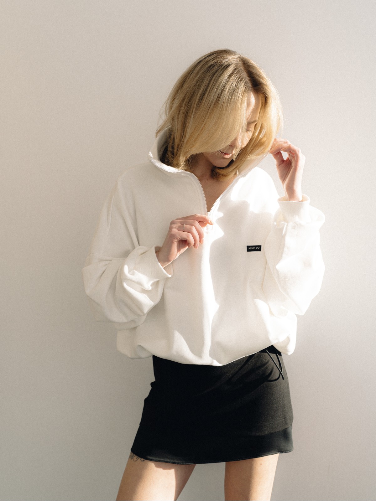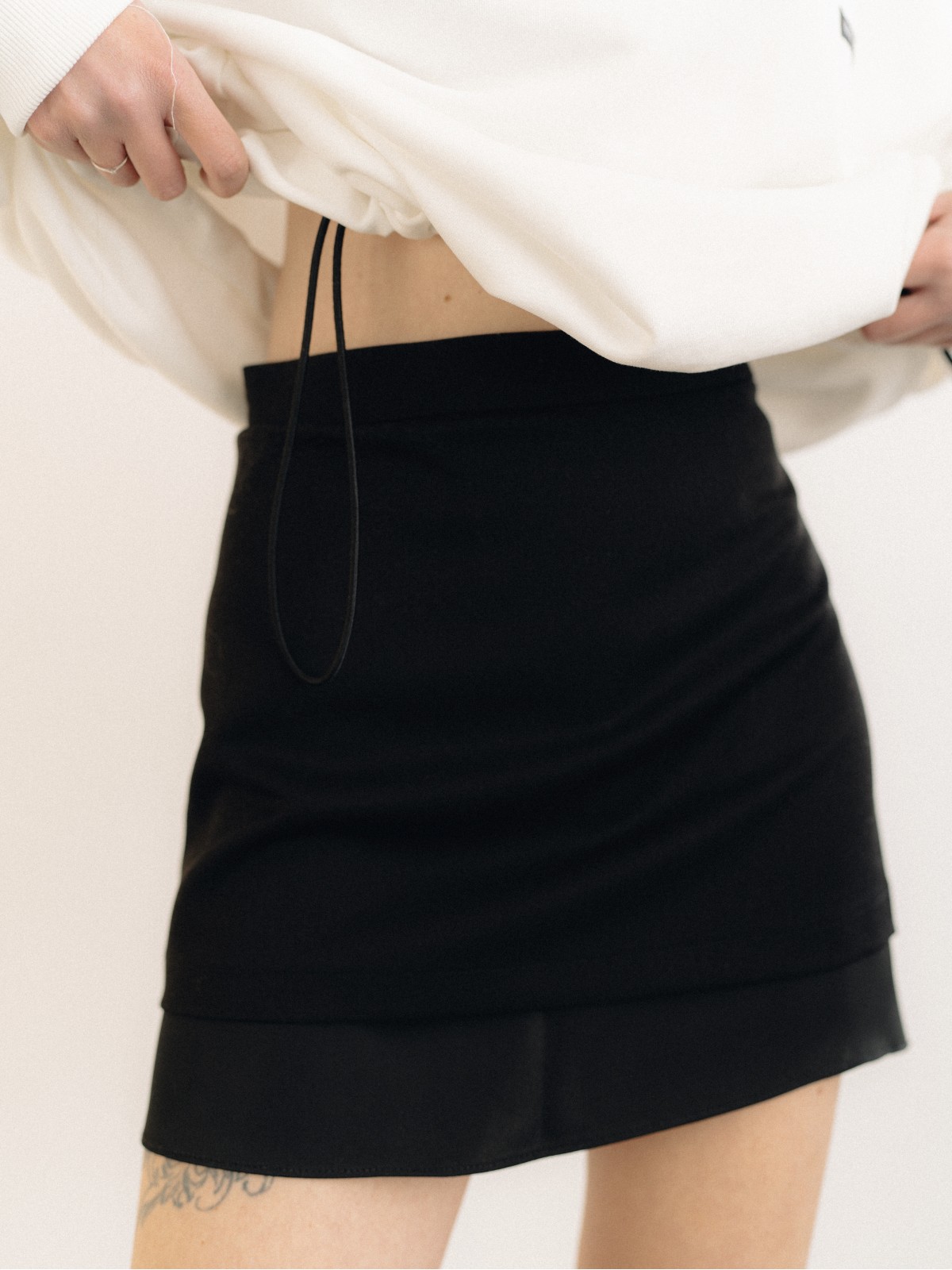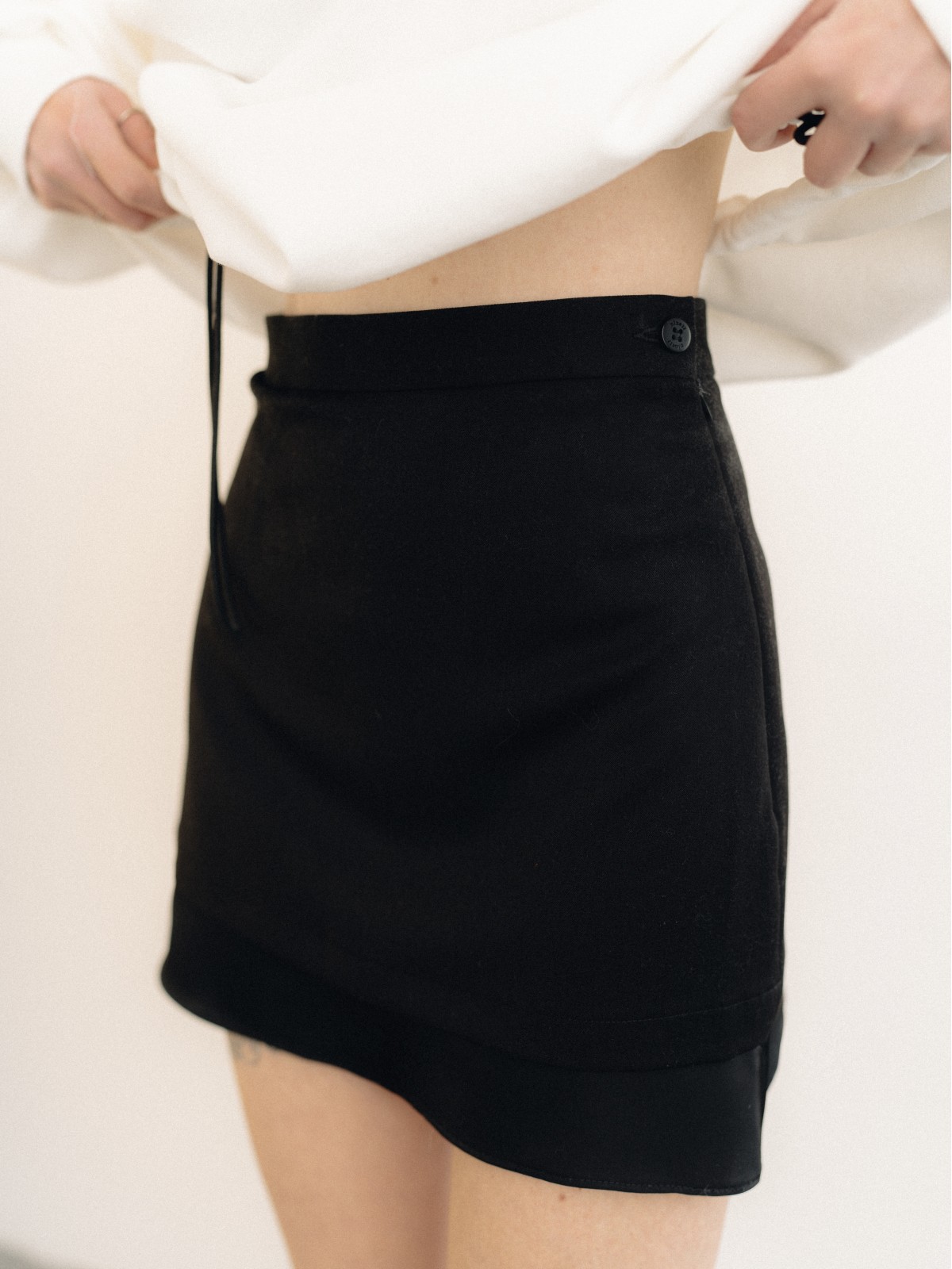 Чёрная юбка мини с аккуратной длиной и деликатным атласным краем по низу. Контраст тканей добавляет образу изящный акцент и подчёркивает силуэт. Минималистичная, но с характером — легко сочетается как с базовыми, так и с вечерними образами.